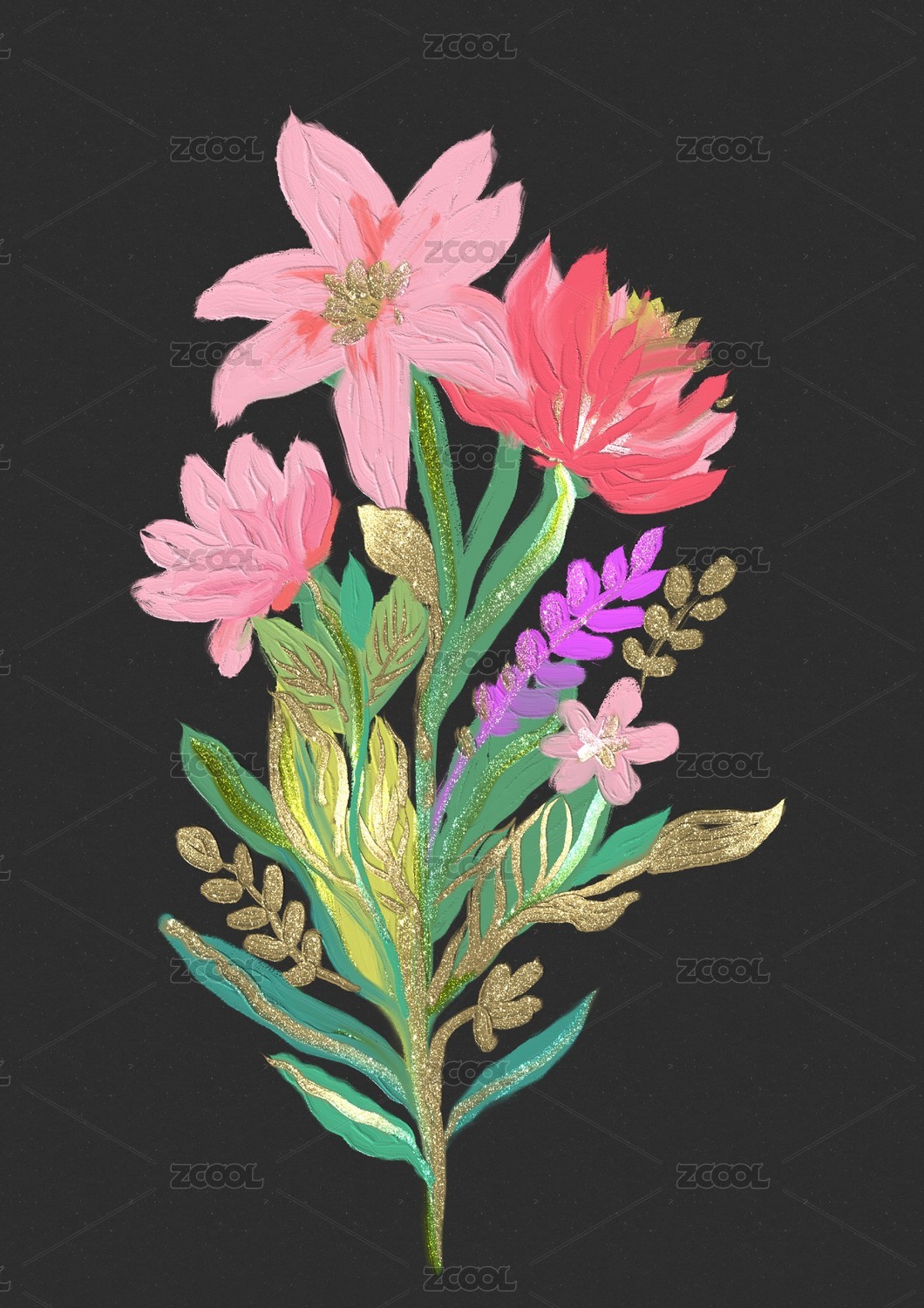黑底厚涂油画质感金色描边粉色绿色花束植物