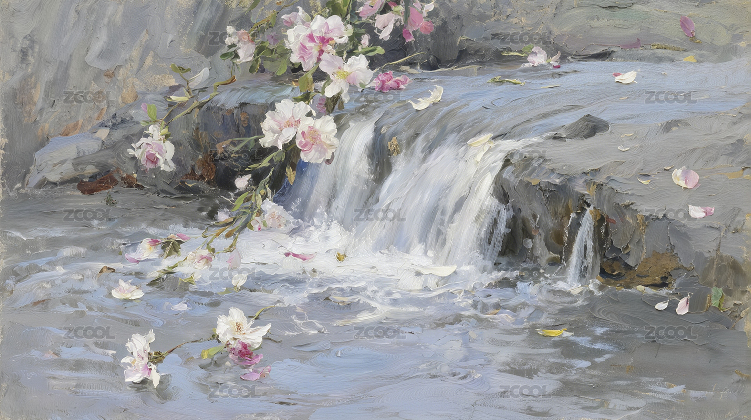 桃花流水高级灰感度朦胧厚涂油画