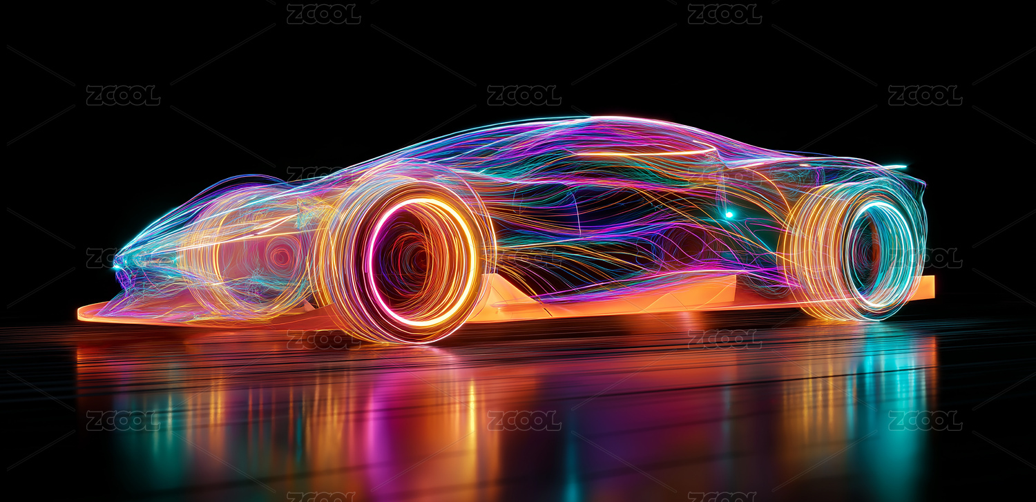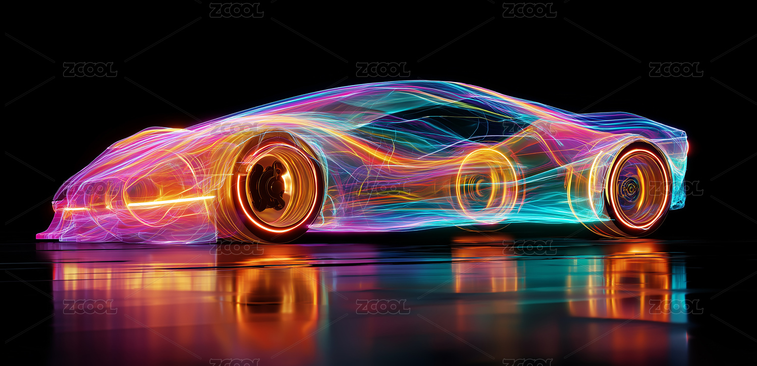 彩色光线构成的汽车模型带反光效果