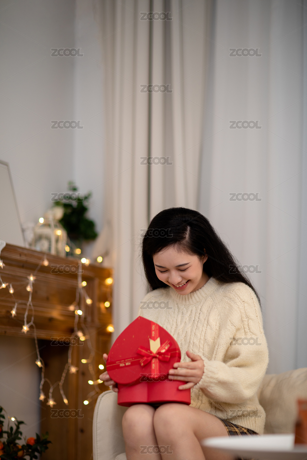 坐在沙发上的美丽女孩打开礼物盒