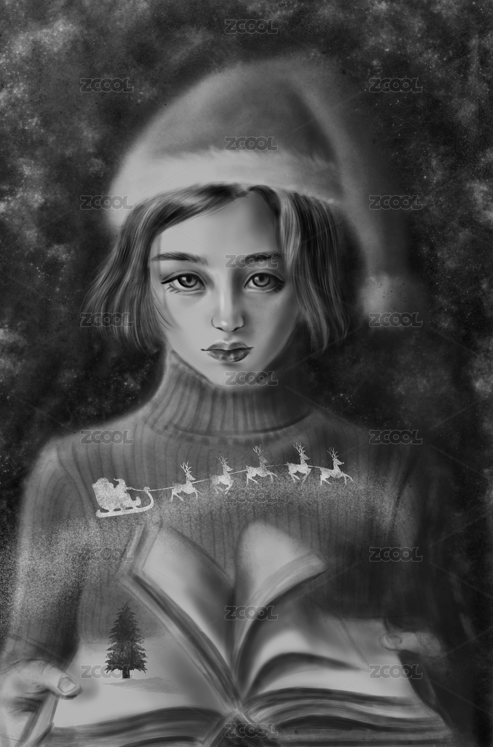 圣诞节黑白素描女孩的礼物
