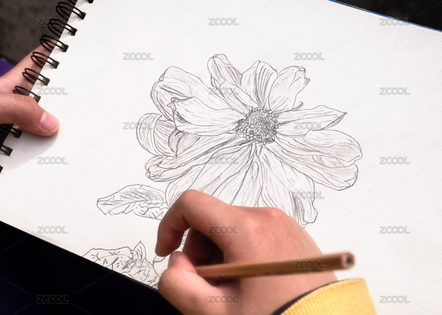 正在用铅笔在白纸上素描写生花朵的人局部特写