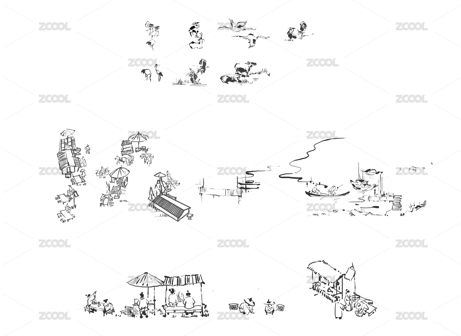 手绘建筑植物人物线稿