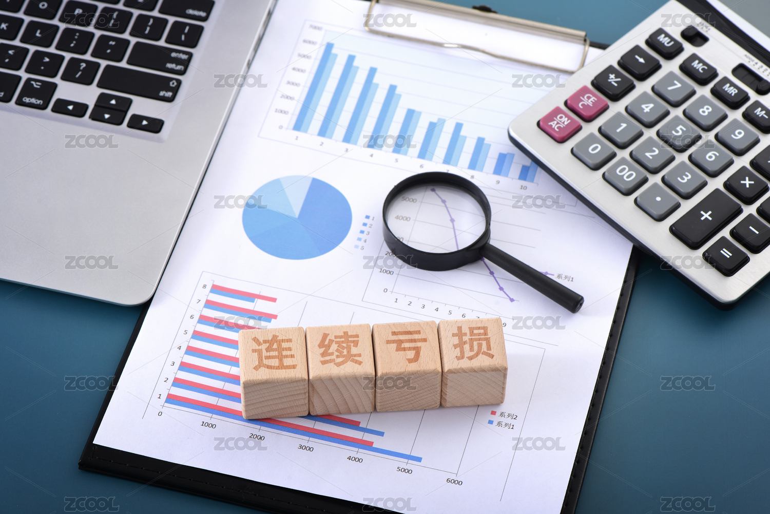 金融办公用品上放着文字积木连续亏损