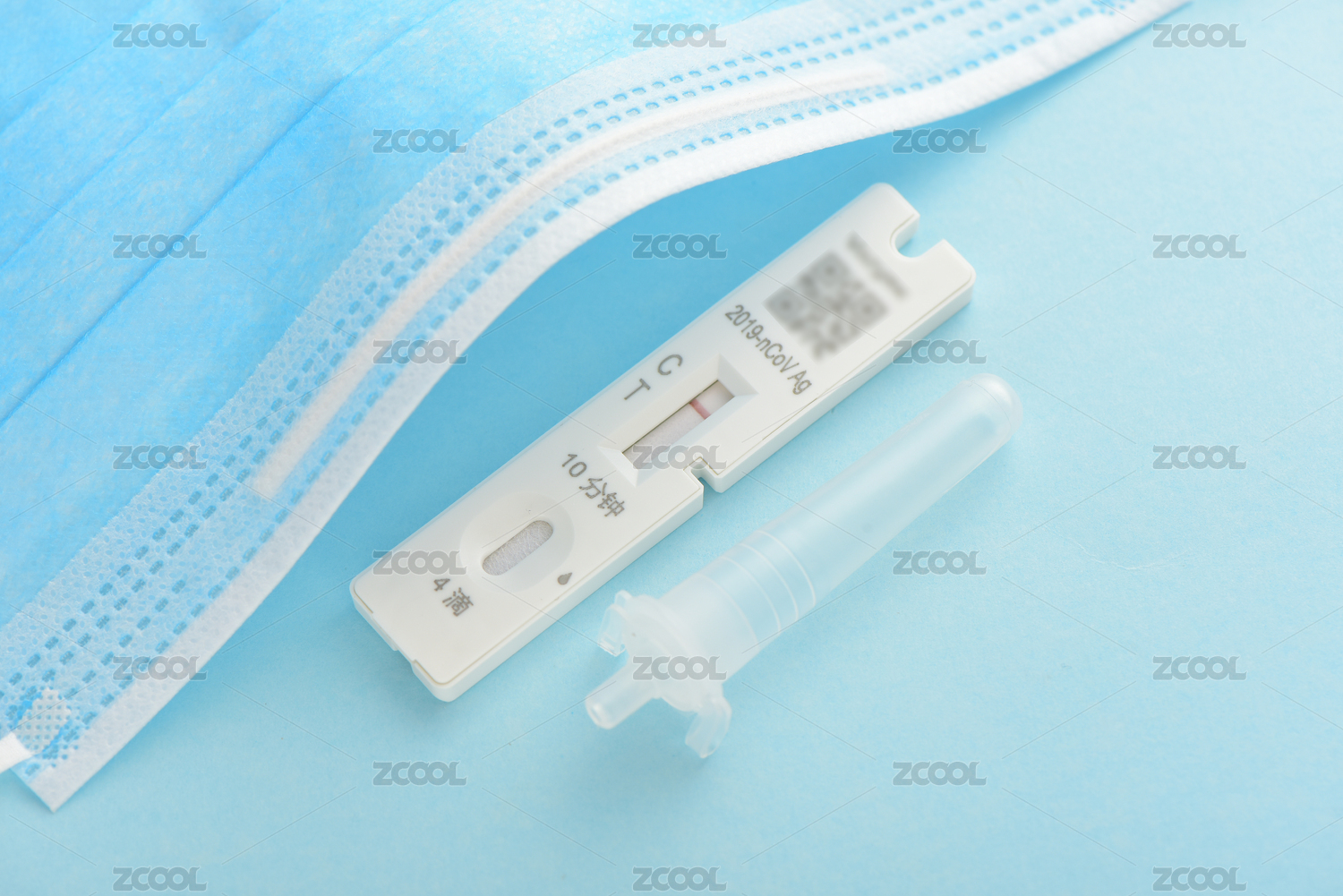 蓝色背景上口罩下的核酸检测抗原检测试剂