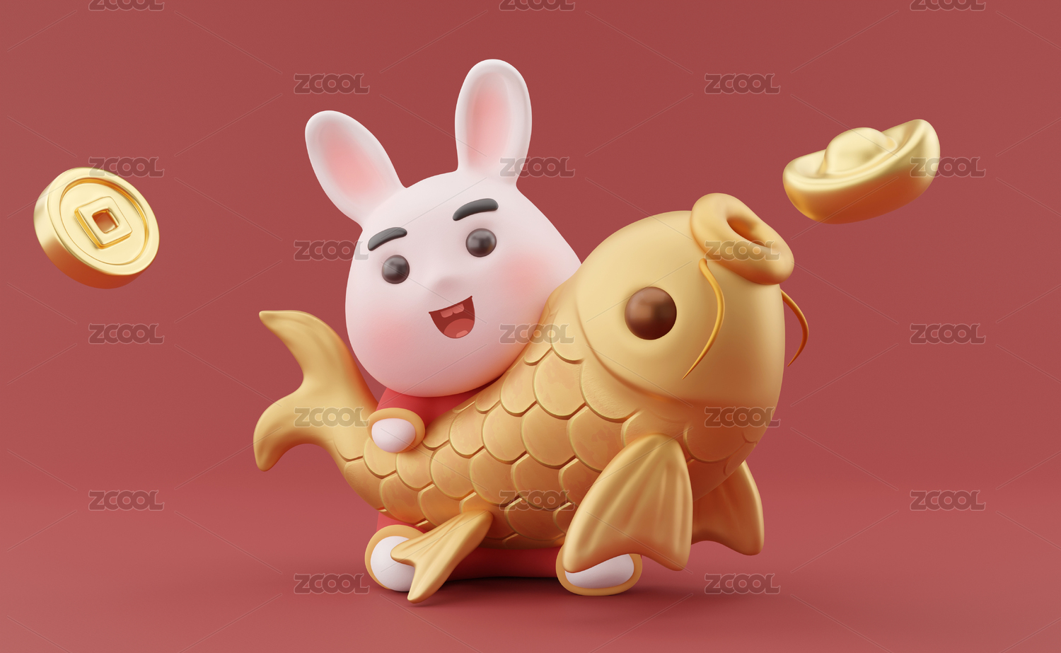 兔年中秋节卡通3D兔子扶着金色鲤鱼