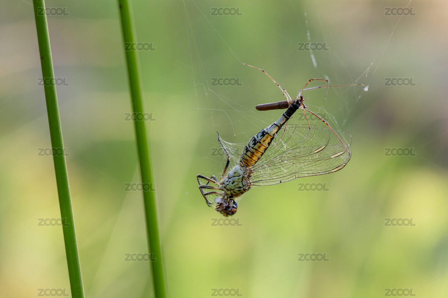 傍晚破了一角的蜘蛛网上蜘蛛捕食一只蜻蜓