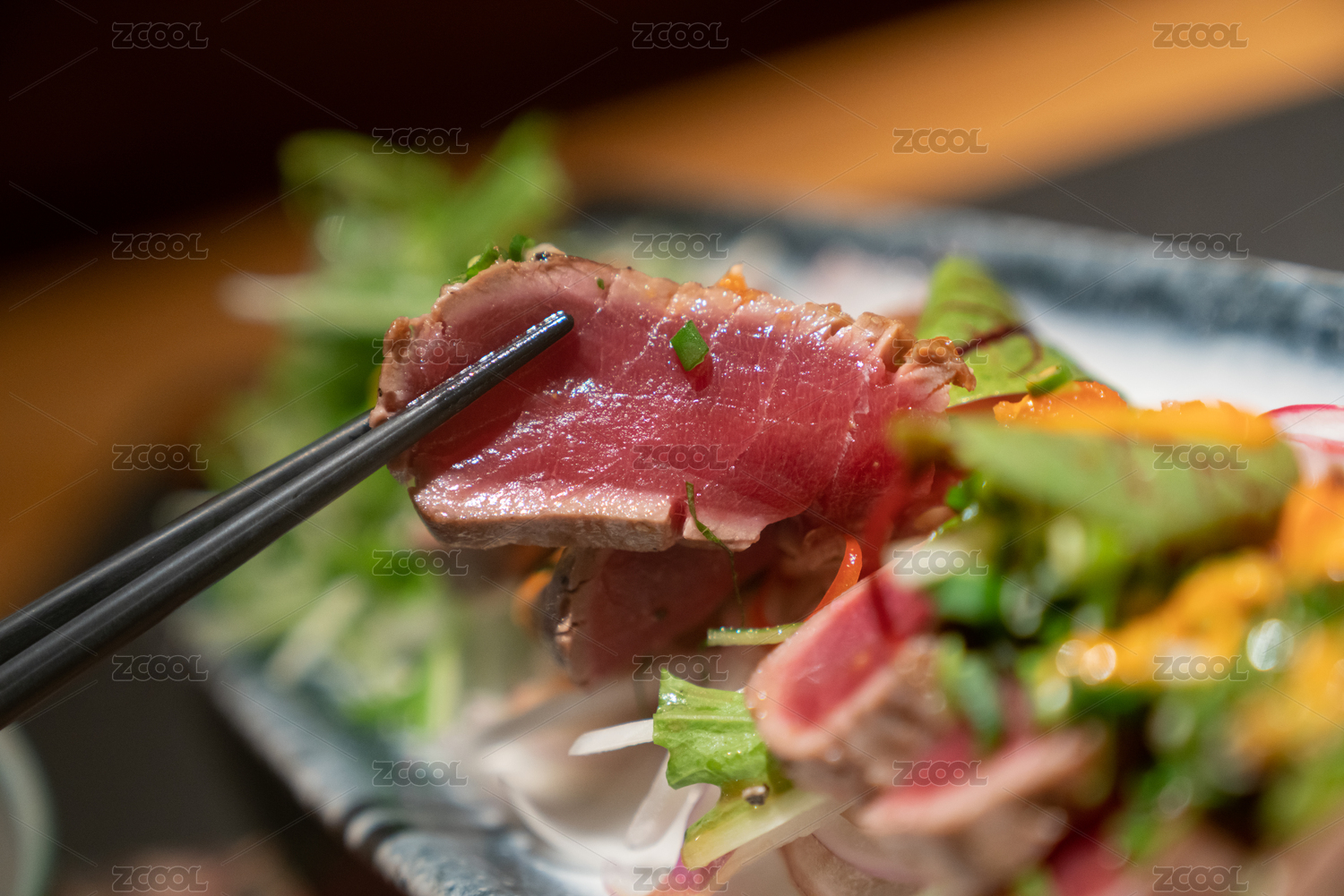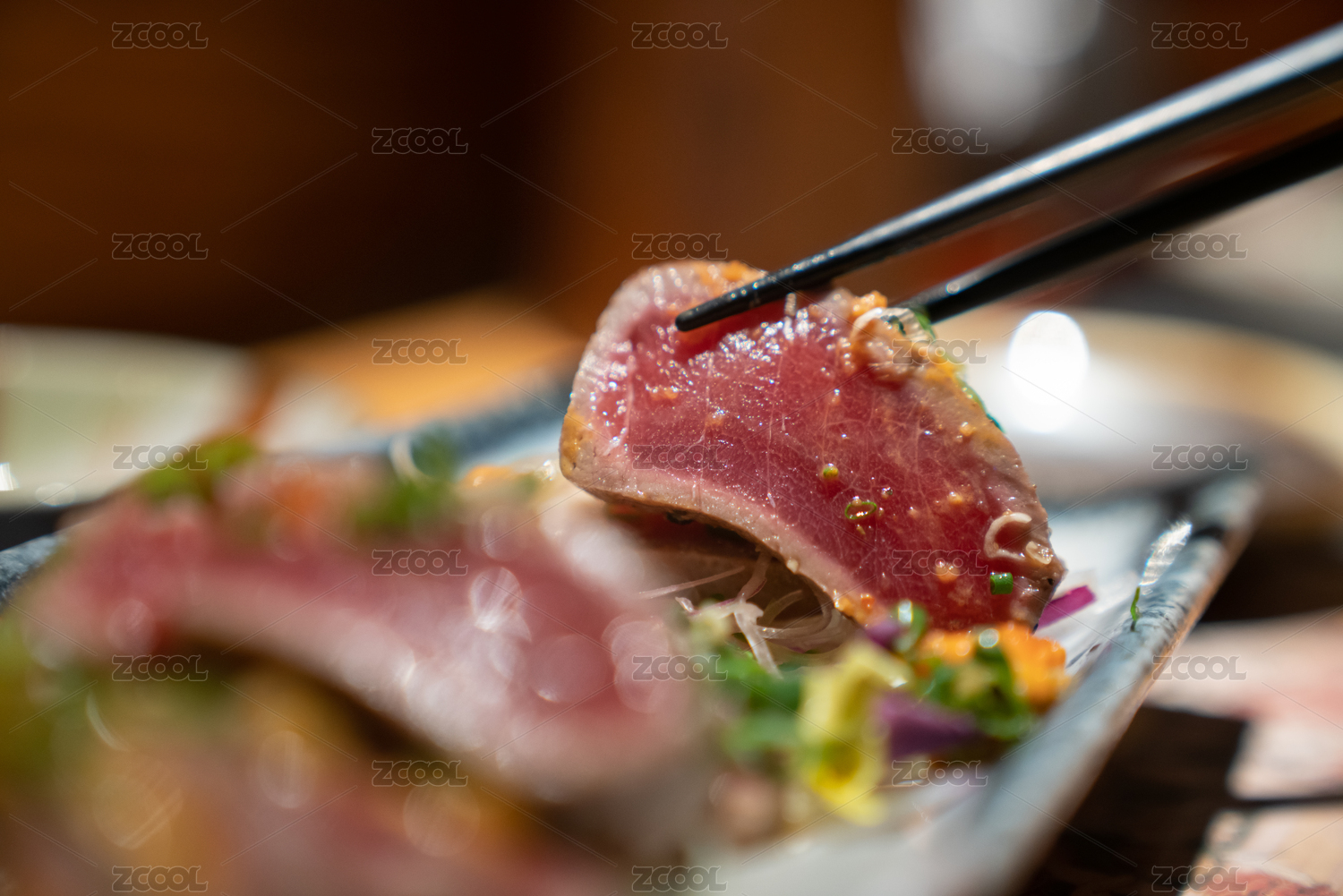 筷子夹起一片鲣鱼切片特写