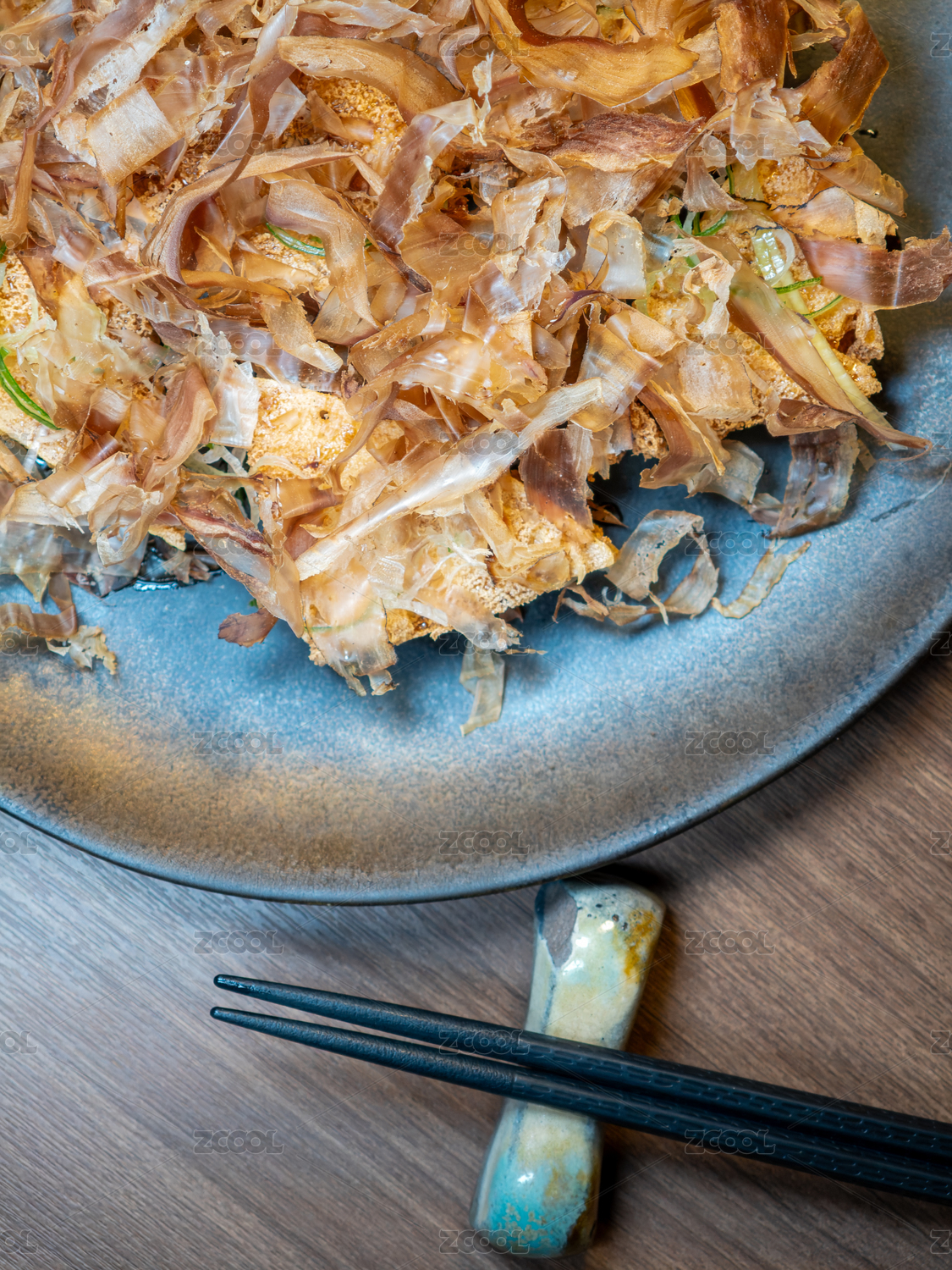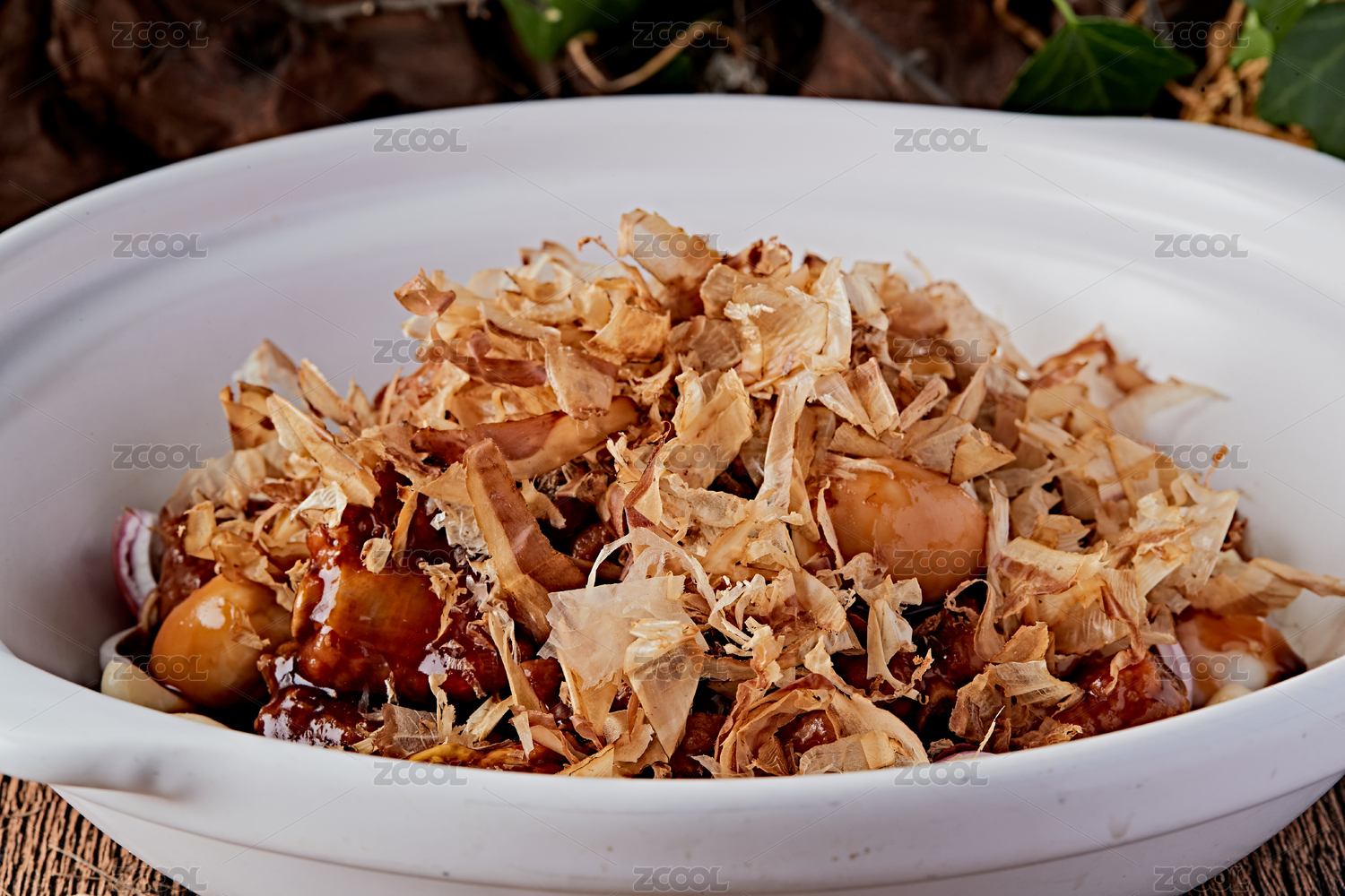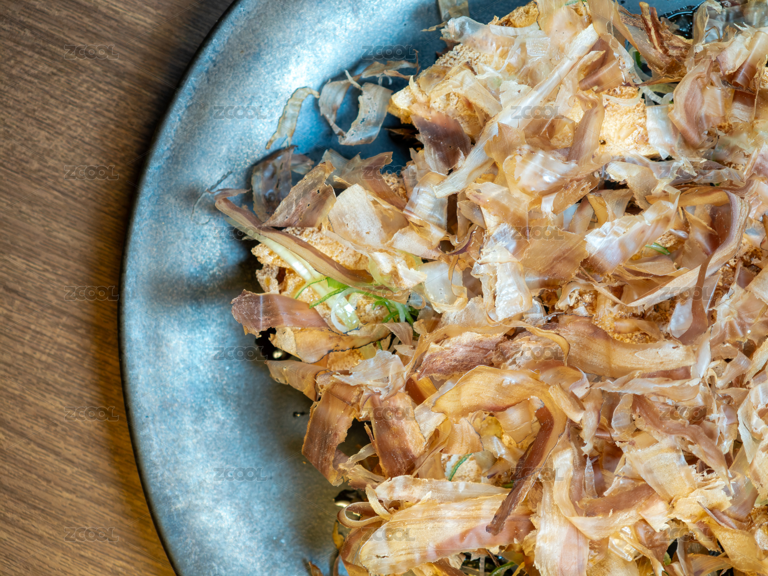 桌面上的盘子里的美味可口的木鱼片