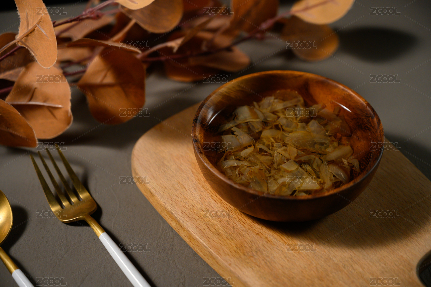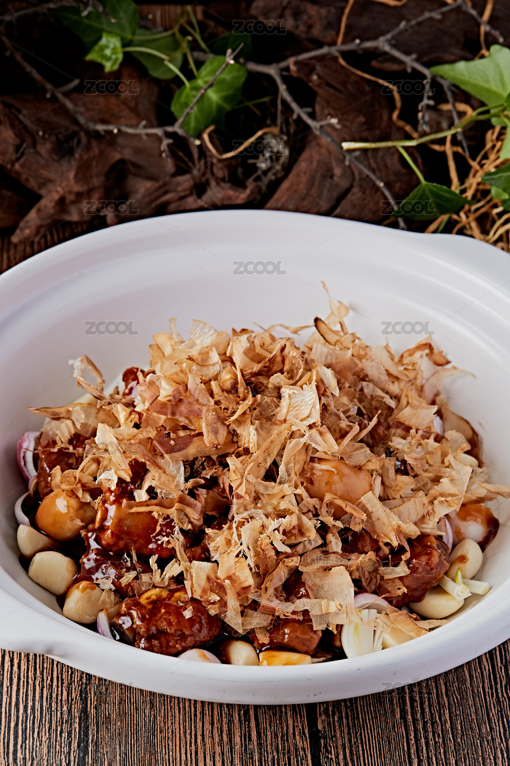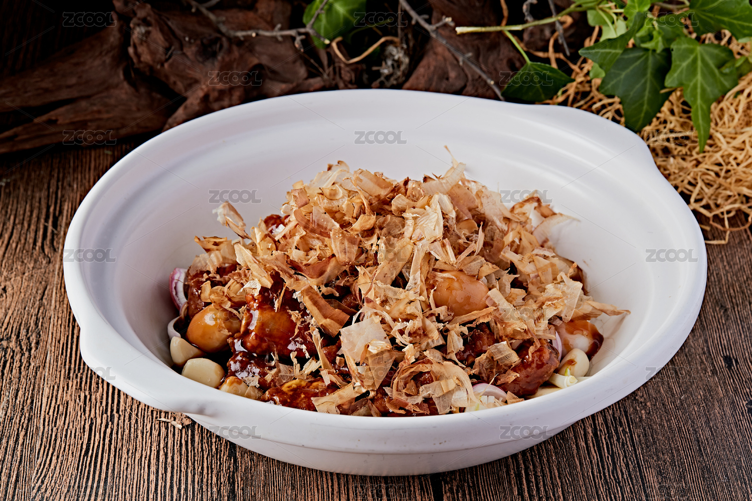桌面上的盘子里的美味可口的木鱼片