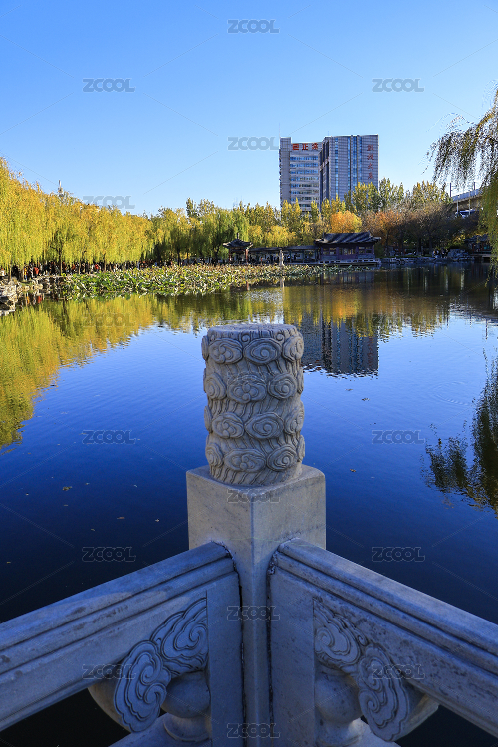 中国天津北宁公园湖泊与石雕、建筑倒影景观