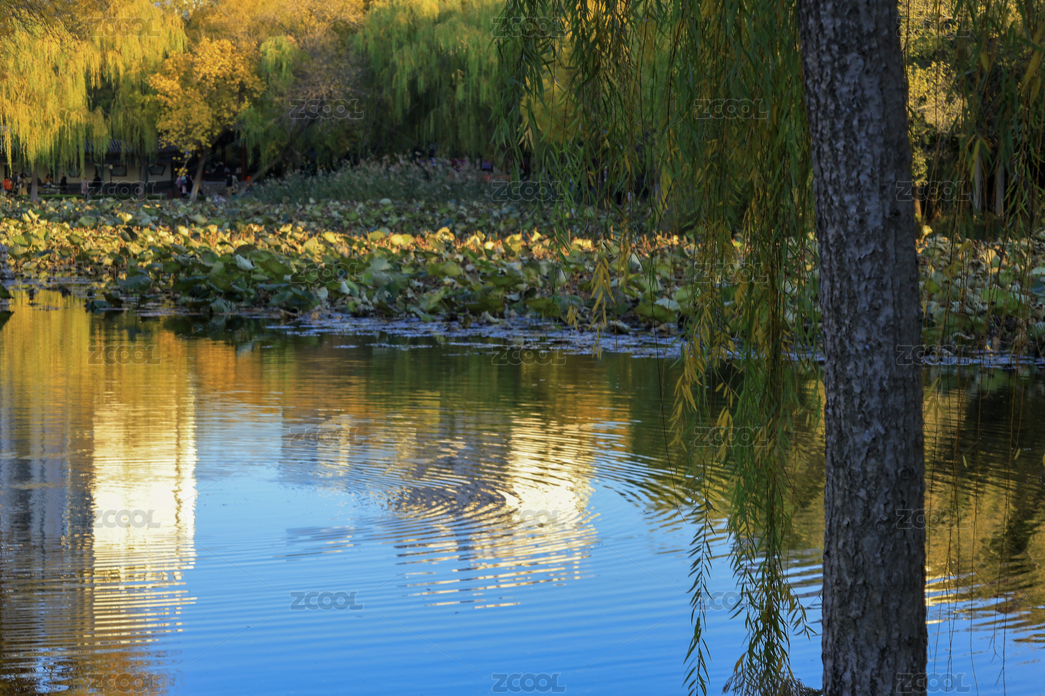 中国天津北宁公园湖泊柳树与秋色倒影景观