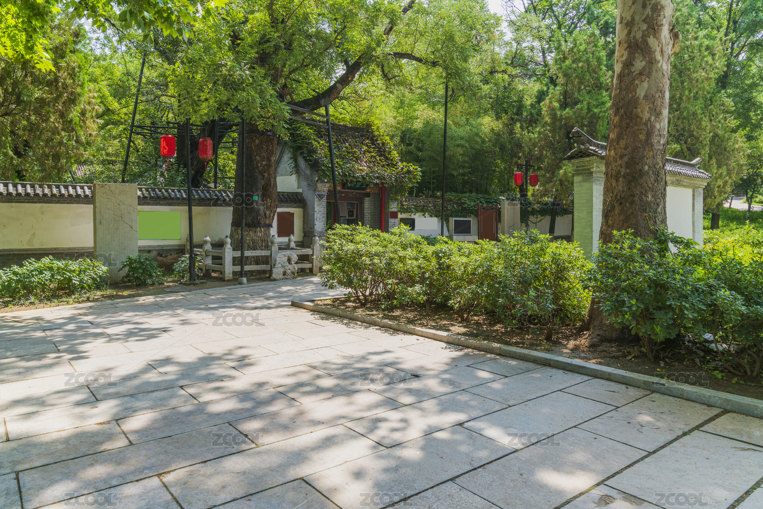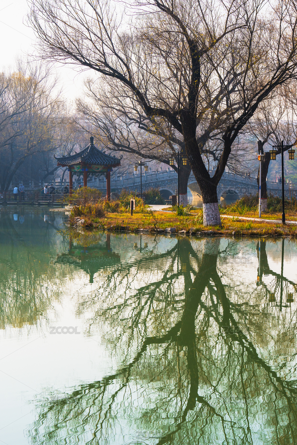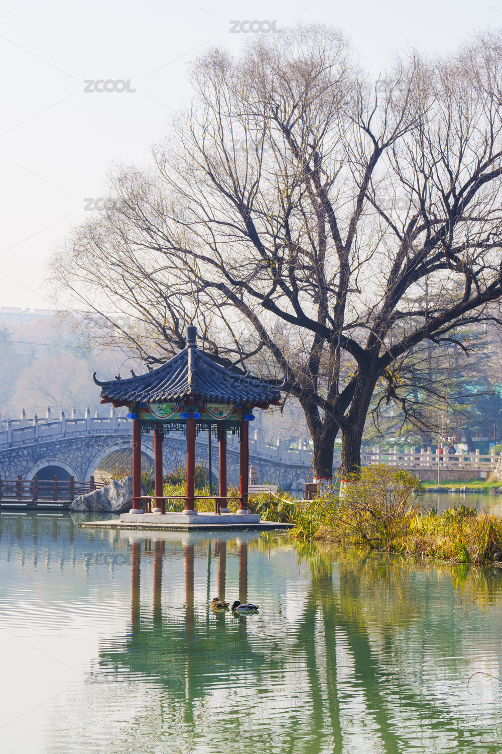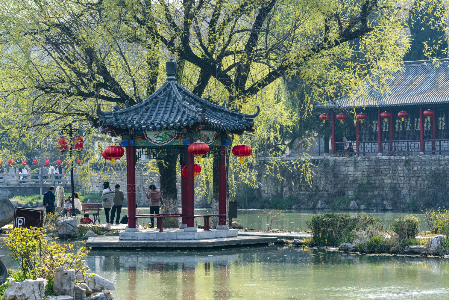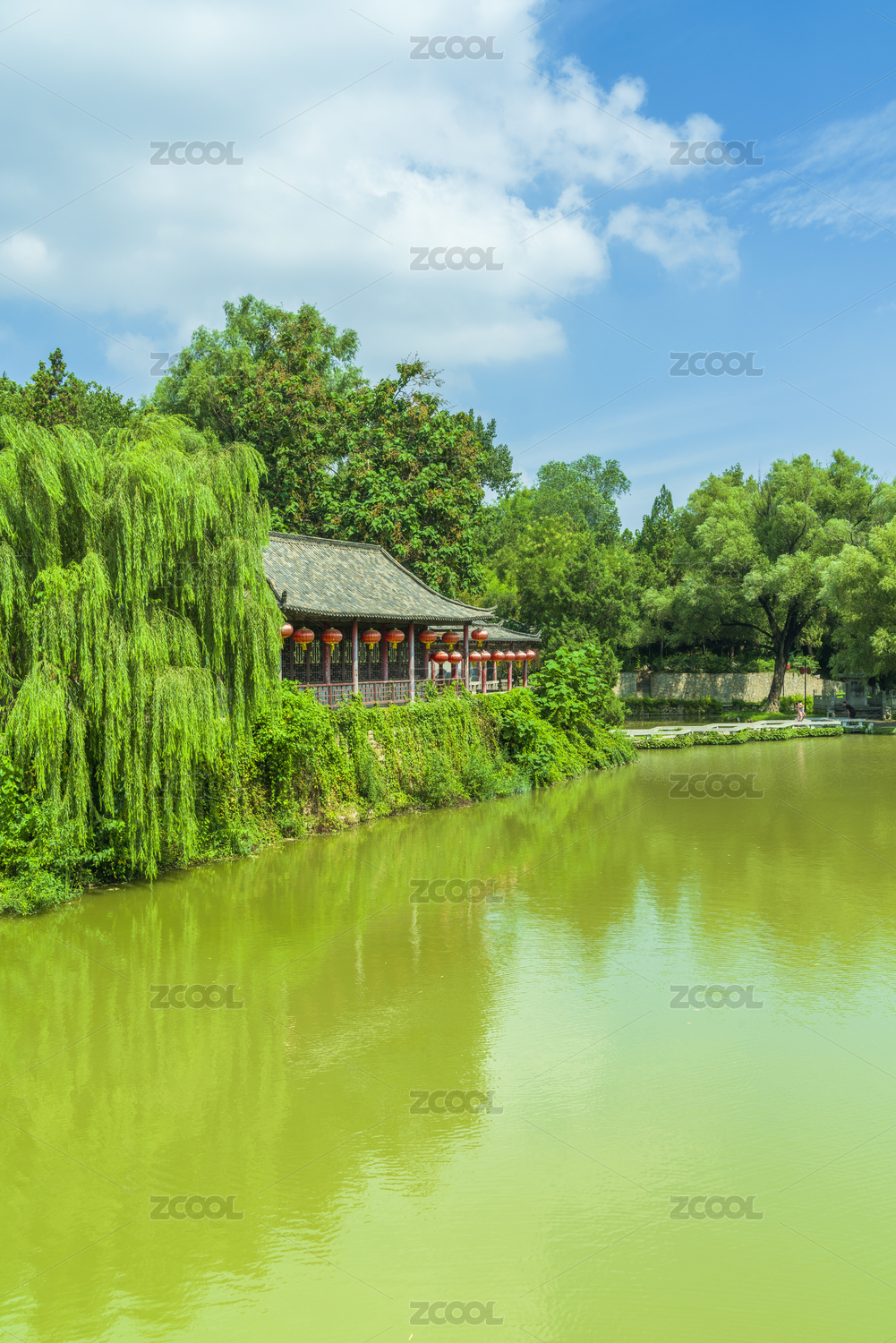 春天青州范公亭公园里的亭子和绿色柳树风景