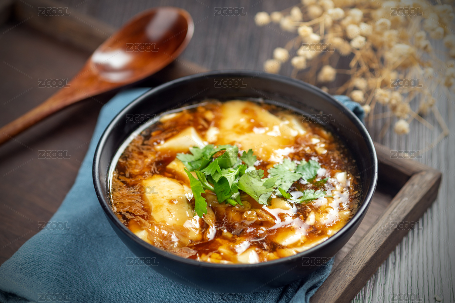 天津美食传统早点小吃豆腐脑摆放在木桌面上