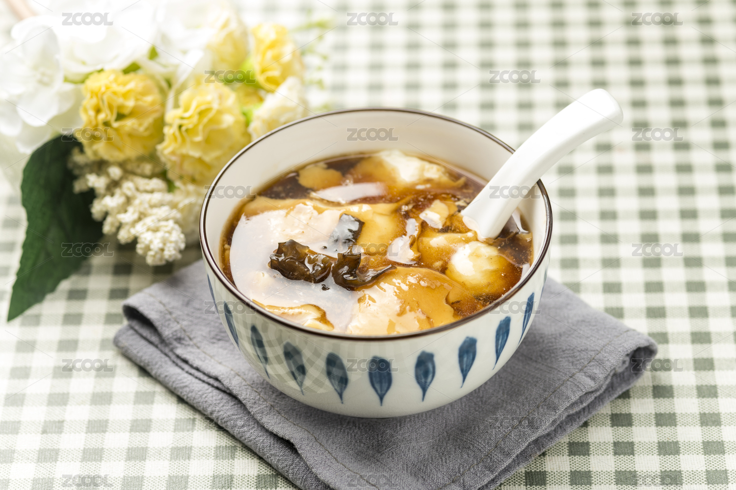 一碗豆腐脑特写格子桌布背景