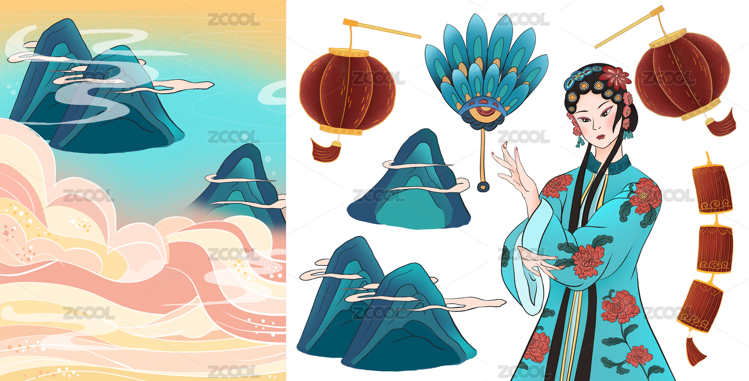 国潮京剧戏曲花纹蓝色戏服花旦女孩灯笼山云