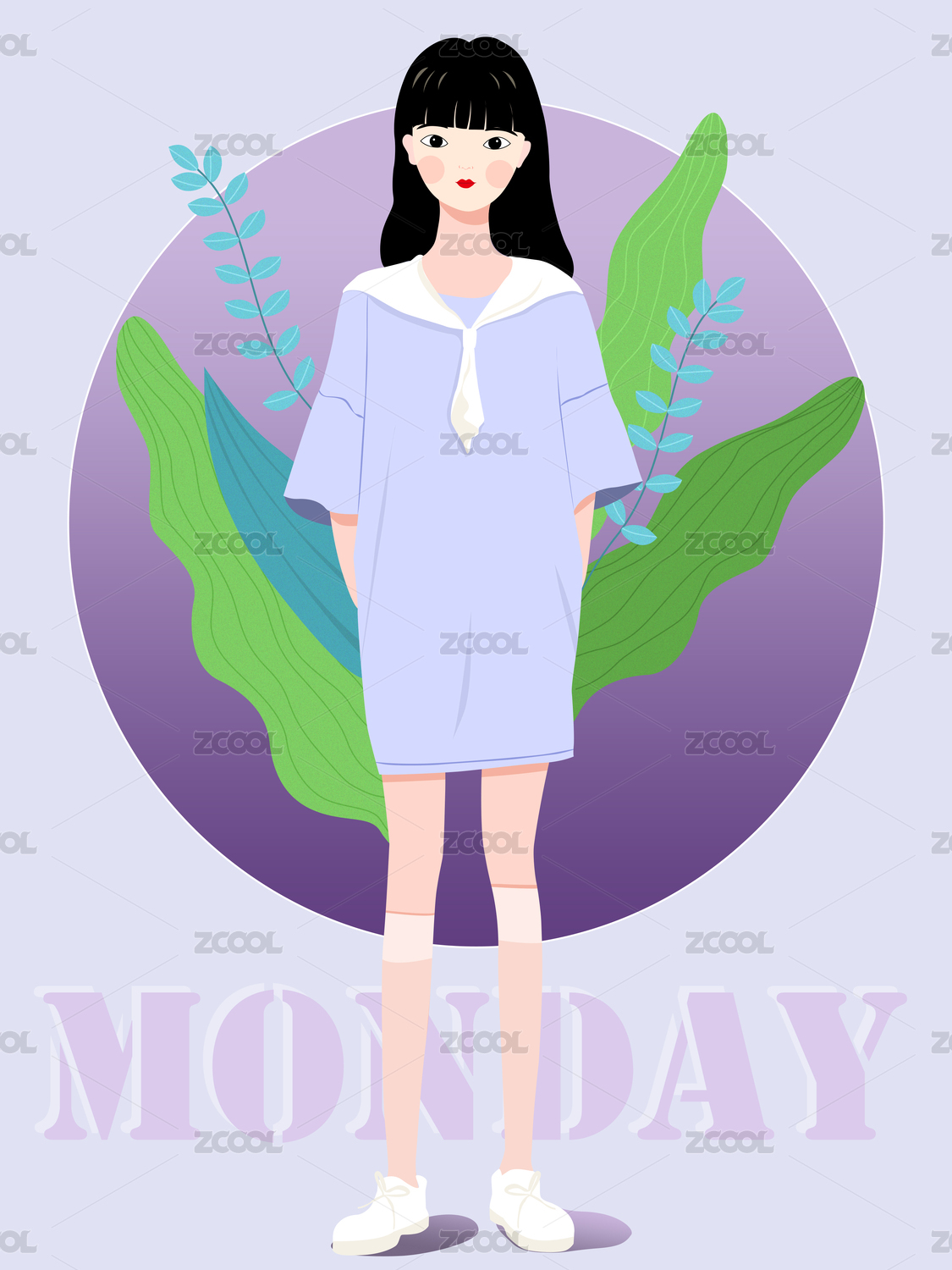 在蓝色花朵包围中长着翅膀的精灵女孩手绘插