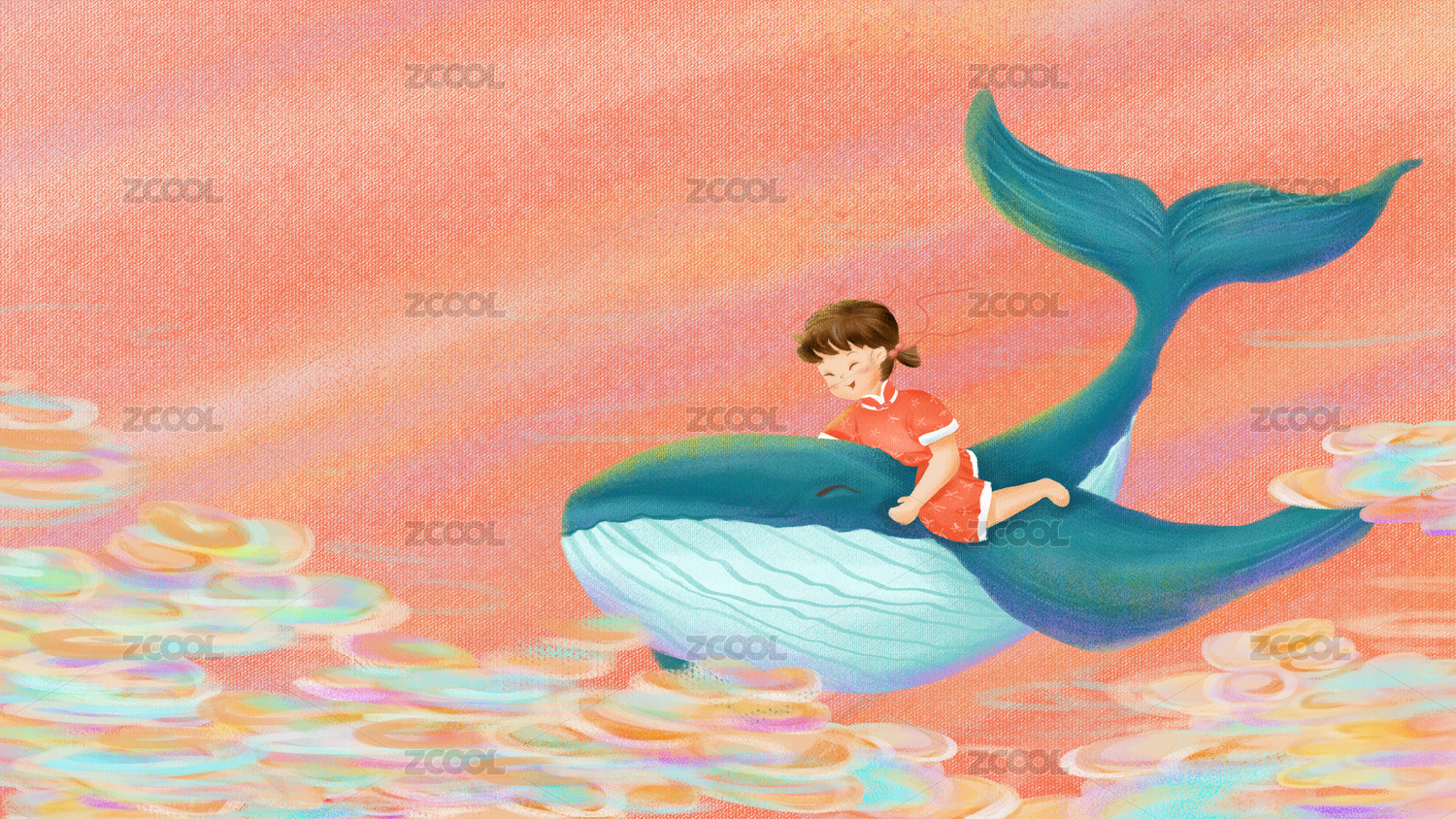 蓝色鲸鱼载着女孩在彩色云朵的天空中飞行