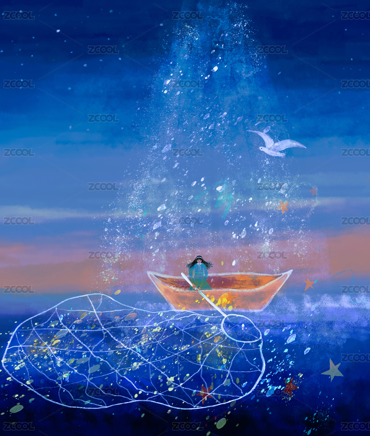一群女孩子夜晚在海中蓝色星空下玩耍