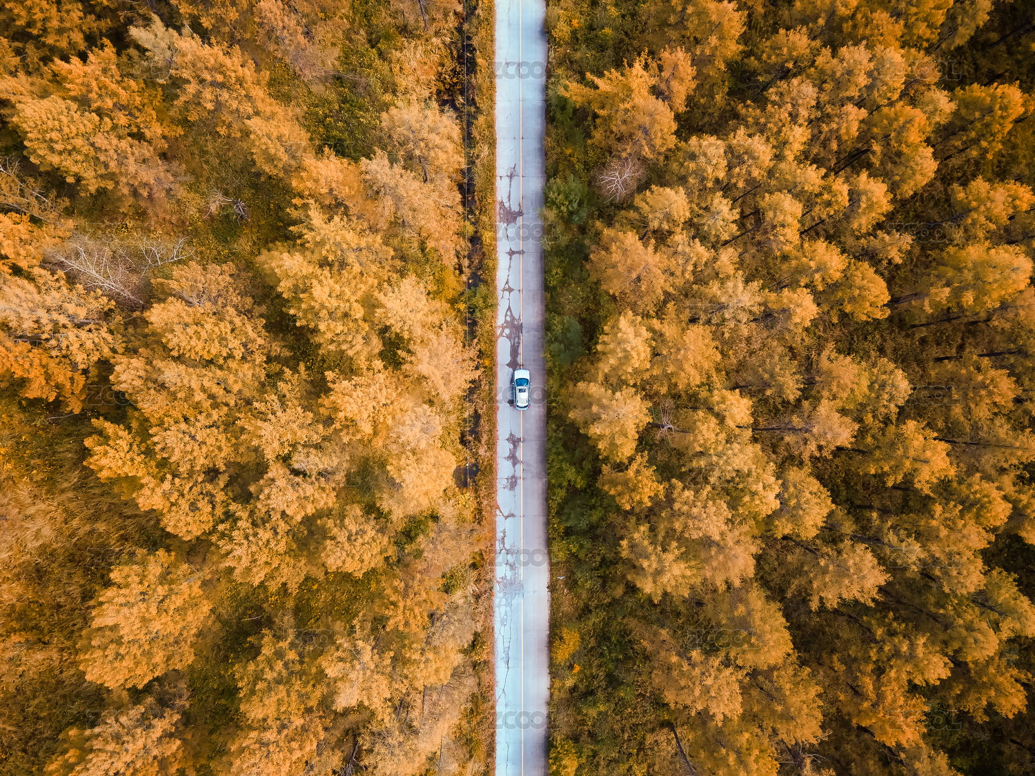 大兴安岭蘑阿公路汽车行驶航拍垂直视角