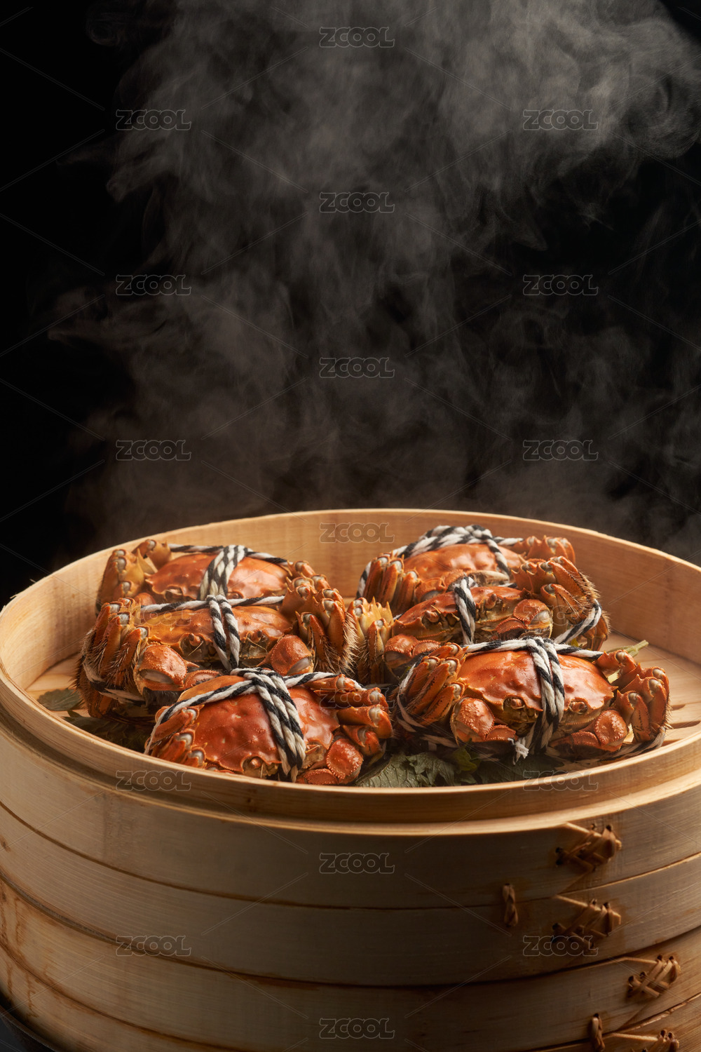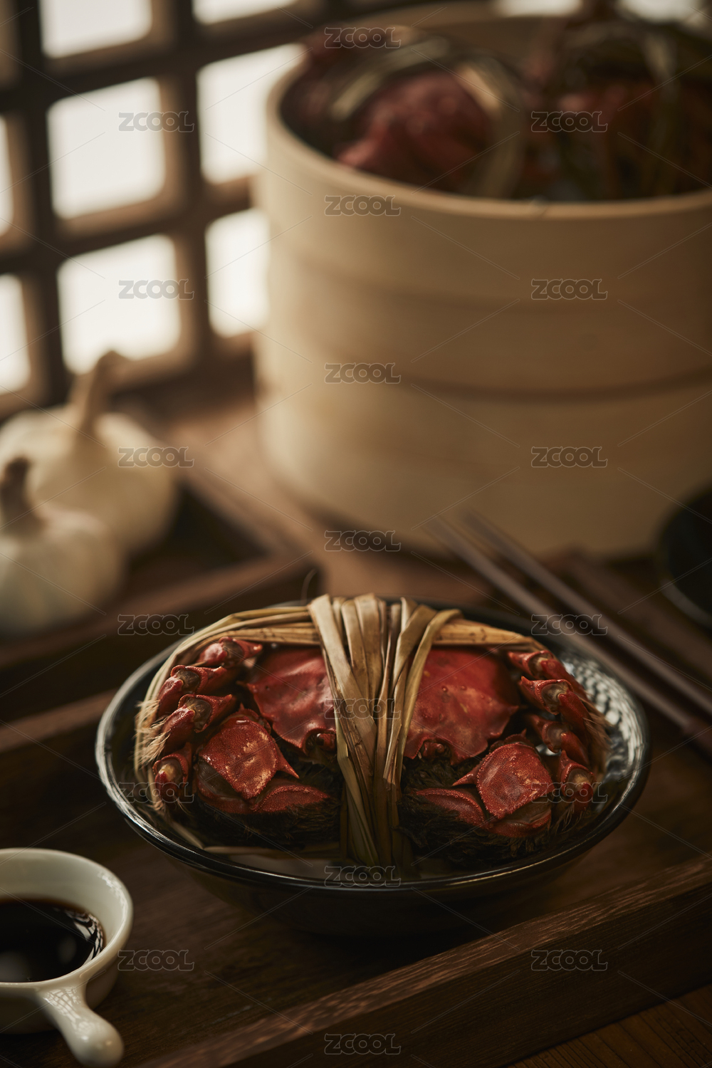 一盘美味的大闸蟹,旁边还放着蒸笼