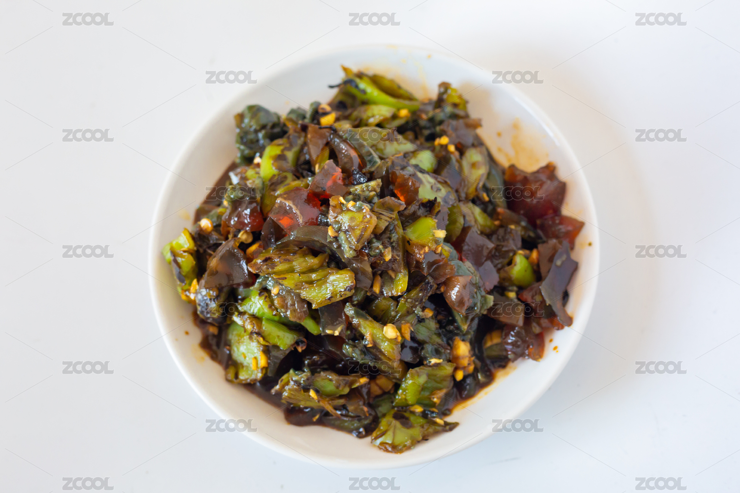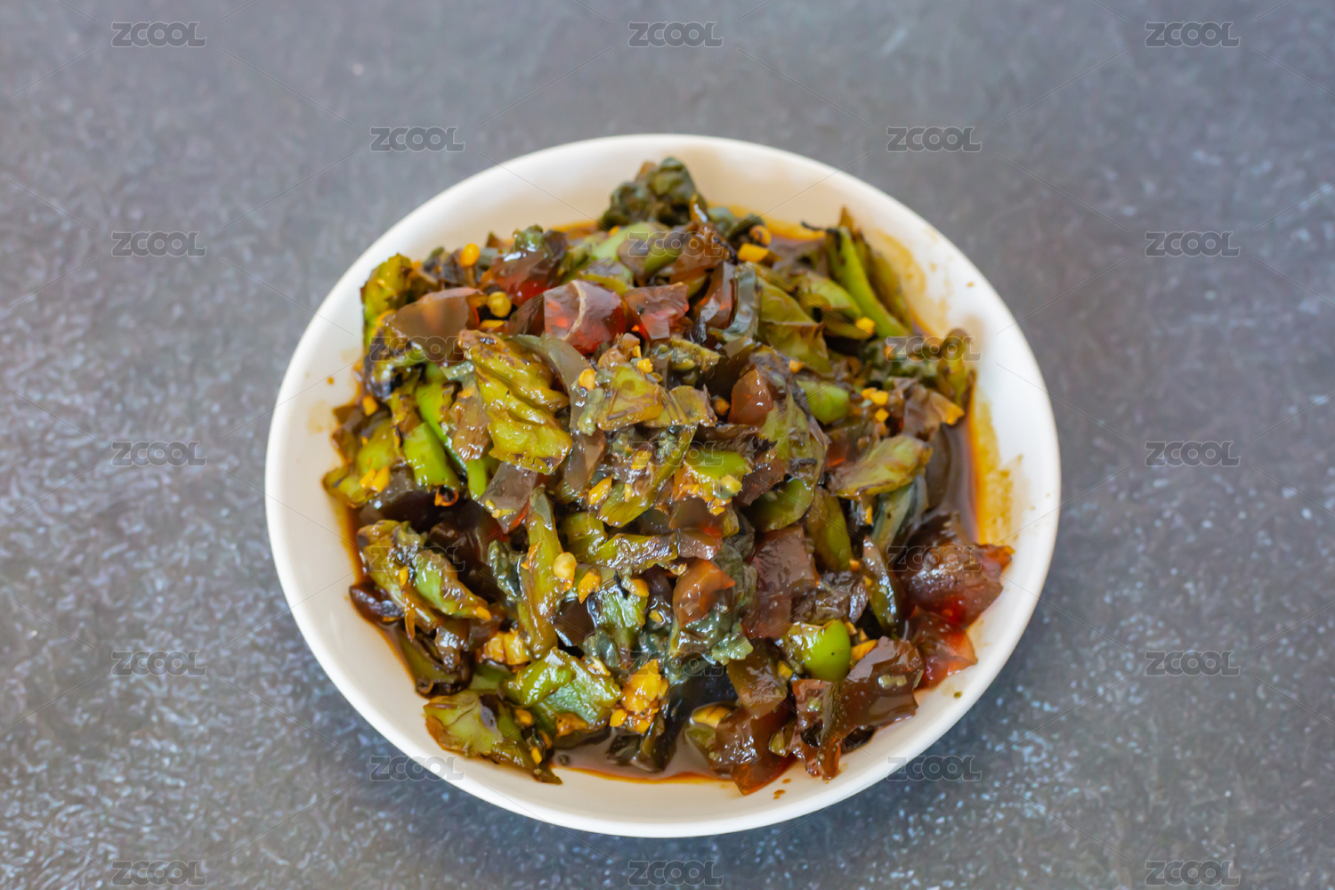 白色瓷盘里的辣椒擂皮蛋