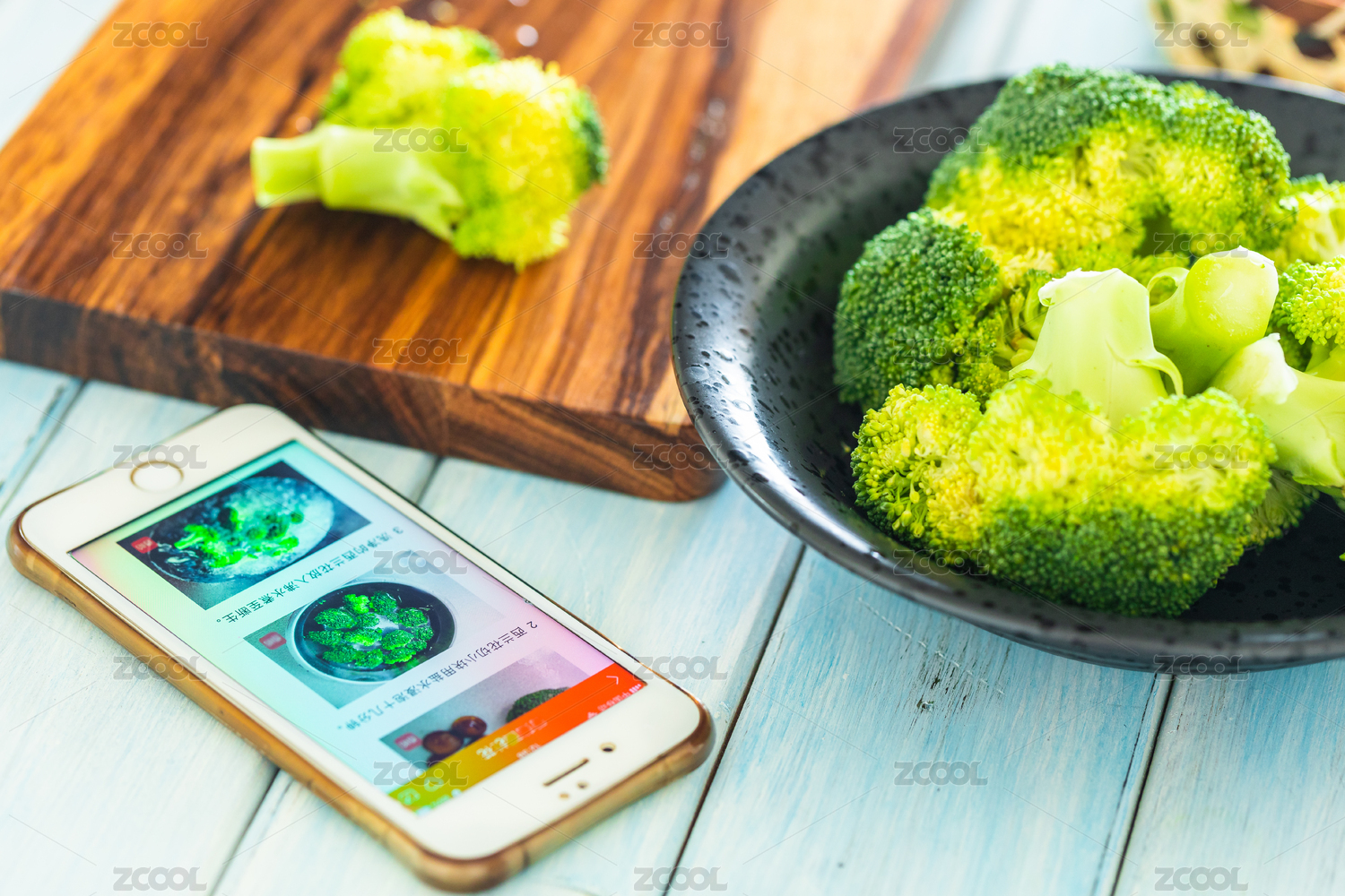 跟着手机上的菜谱学做西兰花