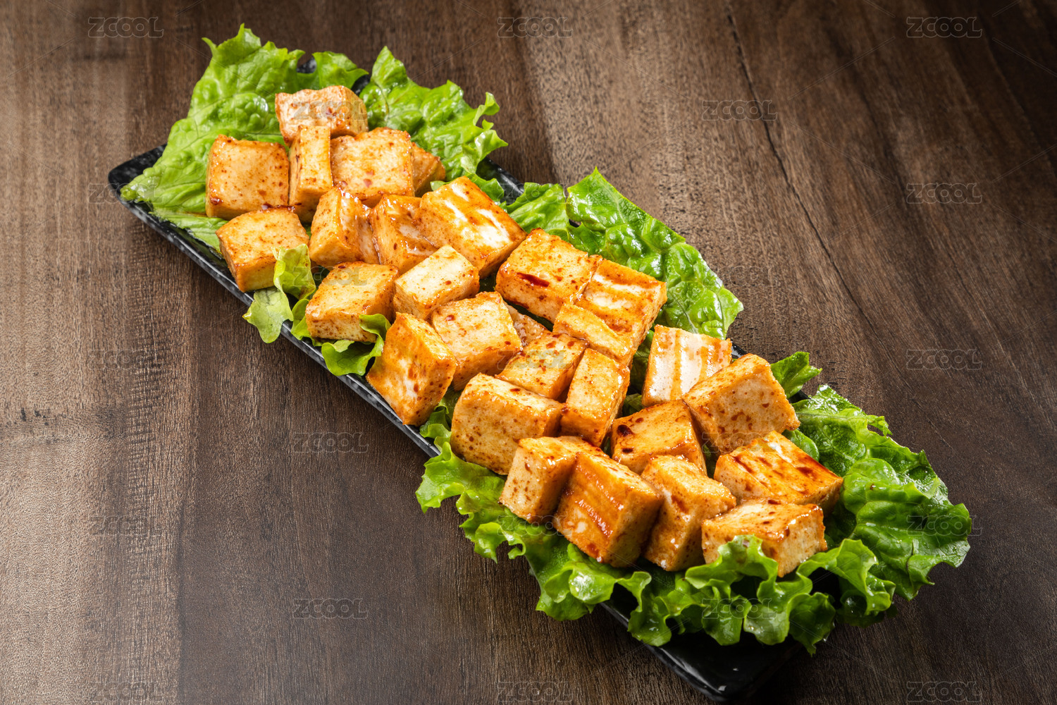 棕色木纹桌上 放着一份腌制鱼豆腐