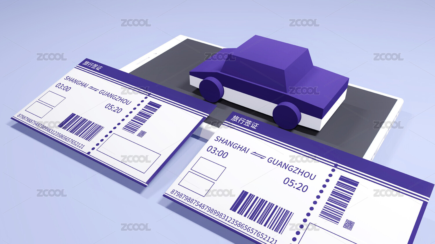 在智能手机屏幕上的,3D汽车模型和旅行签证的概念图片。