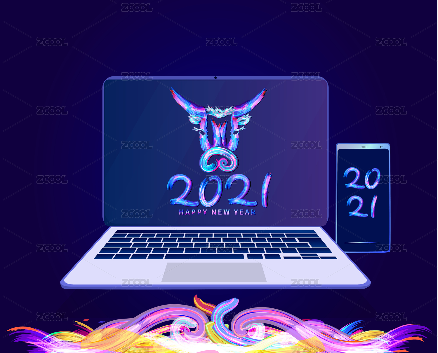 2021新年炫彩荧光色艺术字的牛头插画