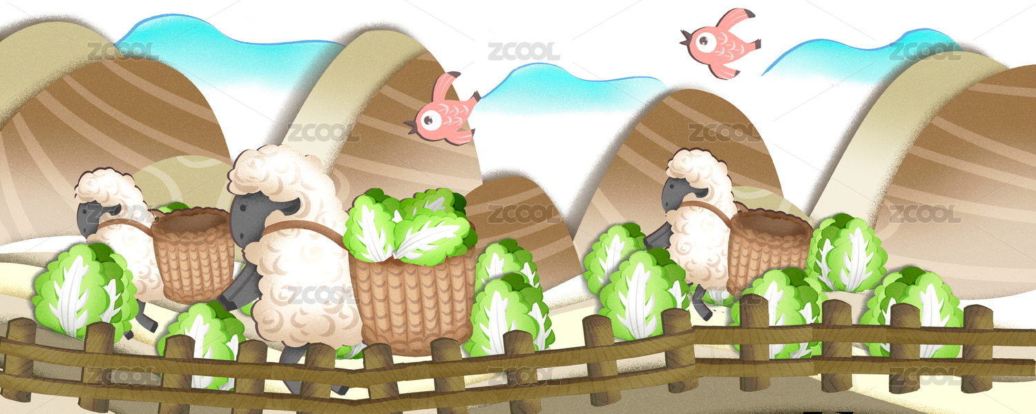 剪纸风格可爱的山羊在菜园收获大白菜插画