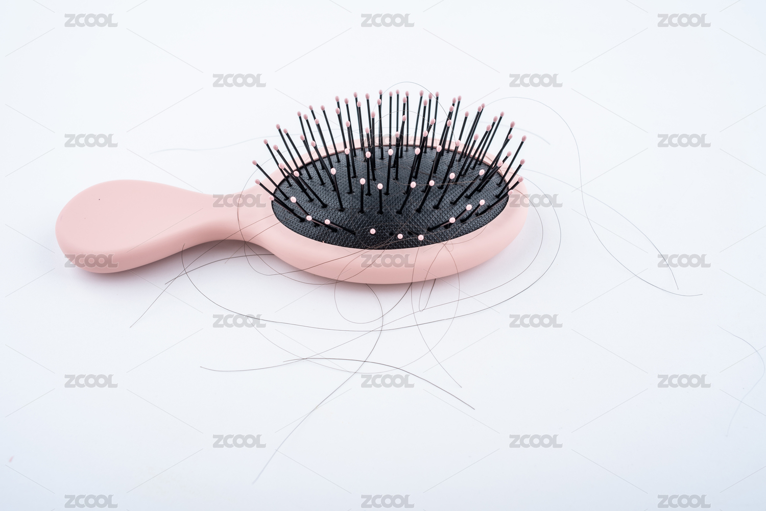 沾满头发的梳子放在白色桌面上