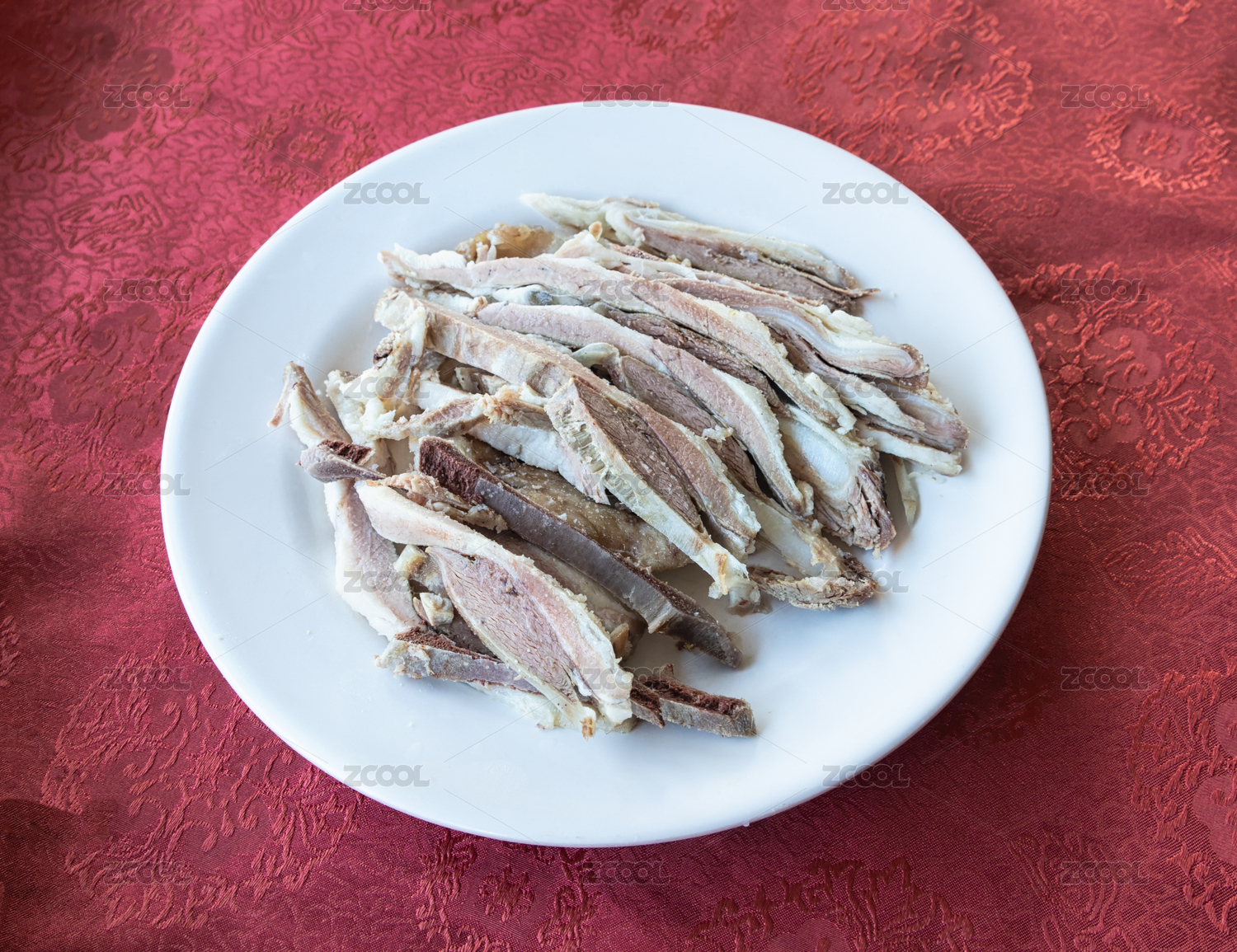 红色餐桌布上一盘白色瓷盘装的中国传统美食手抓羊肉