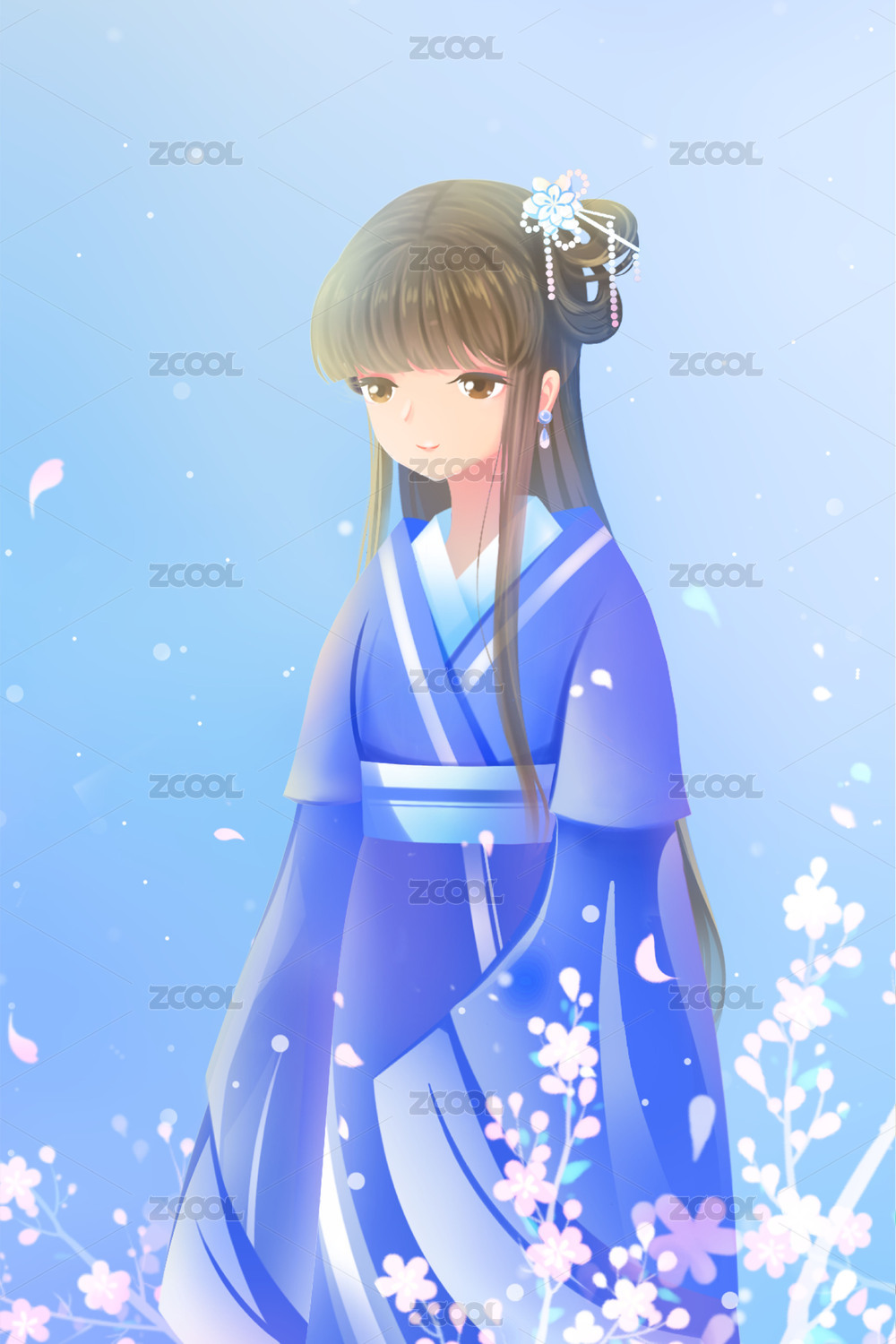 手绘花中古装蓝衣女卡通人物形象蓝色插画