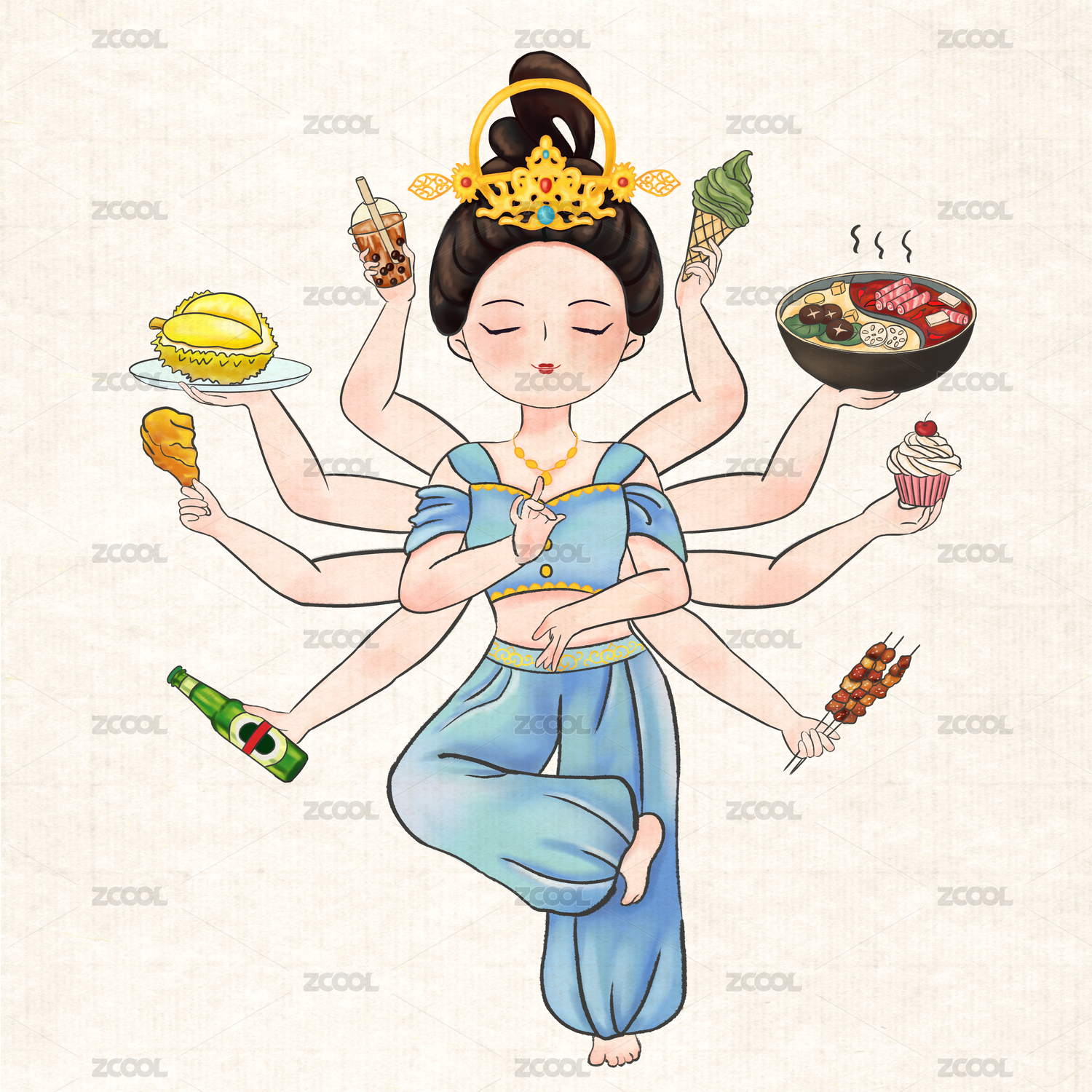古风吃货千手观音手拿各种美食贪吃享受美味
