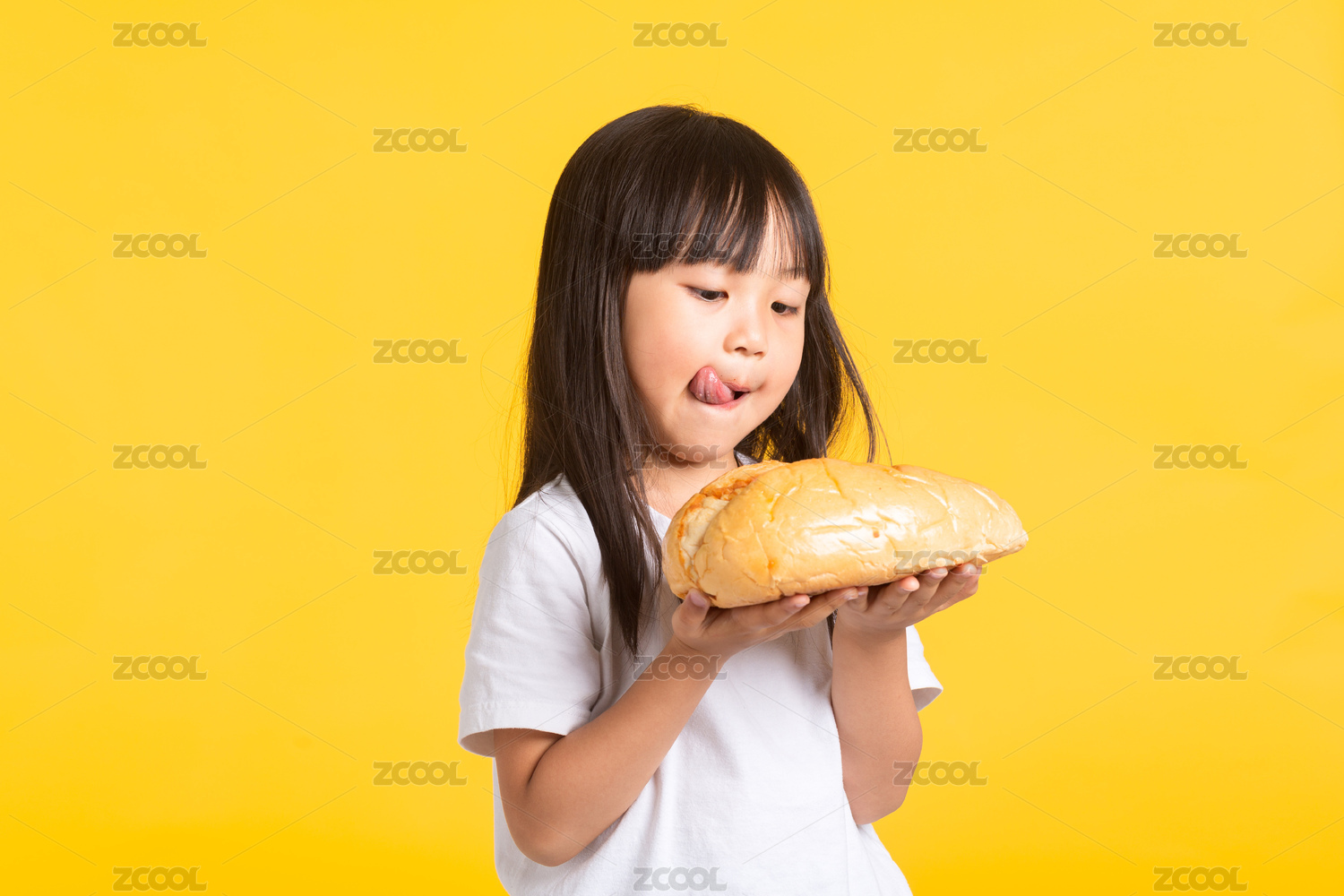 贪吃的亚洲小女孩吃面包时嘬手指头