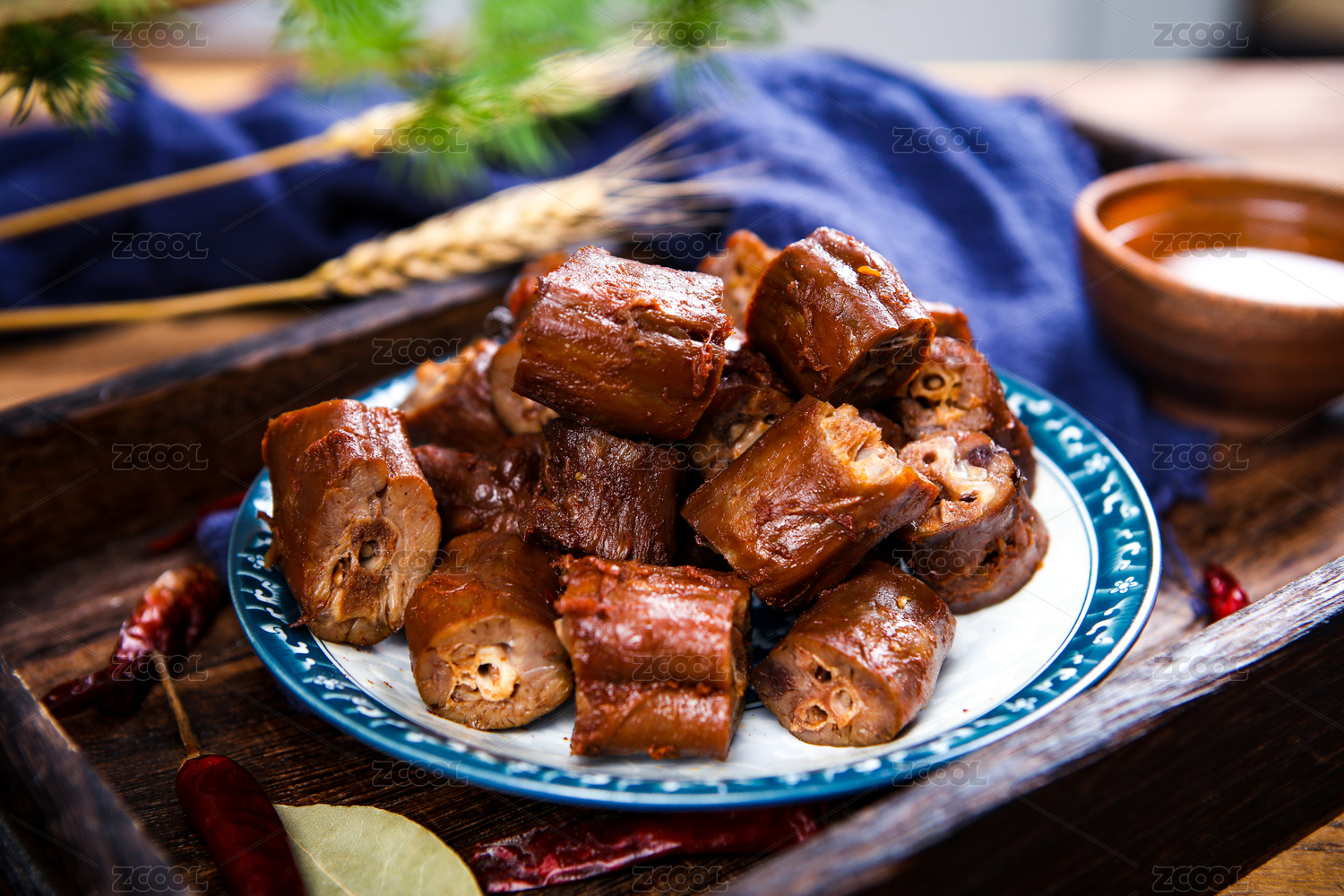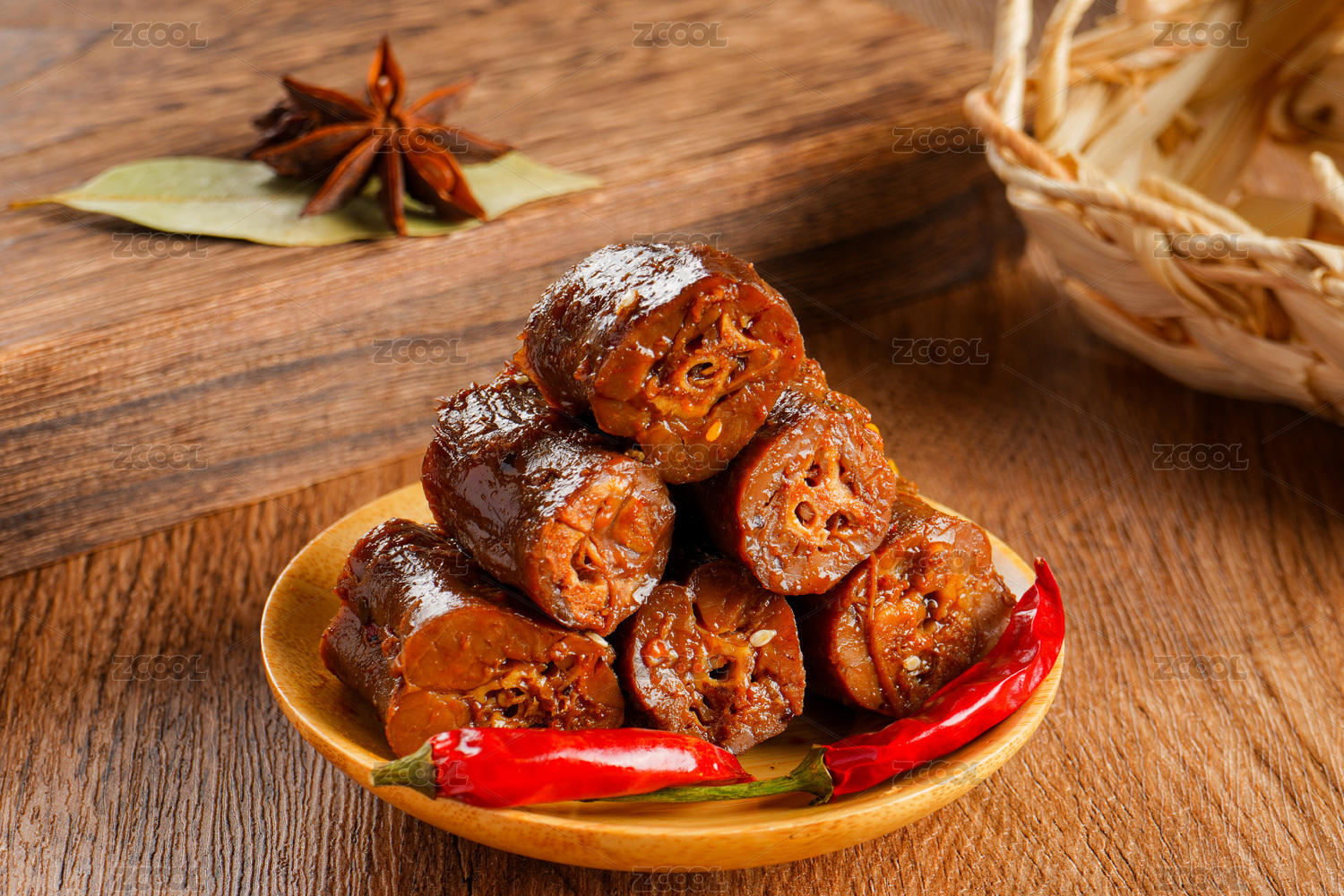 木纹背景上摆放的麻辣黑鸭鸭脖