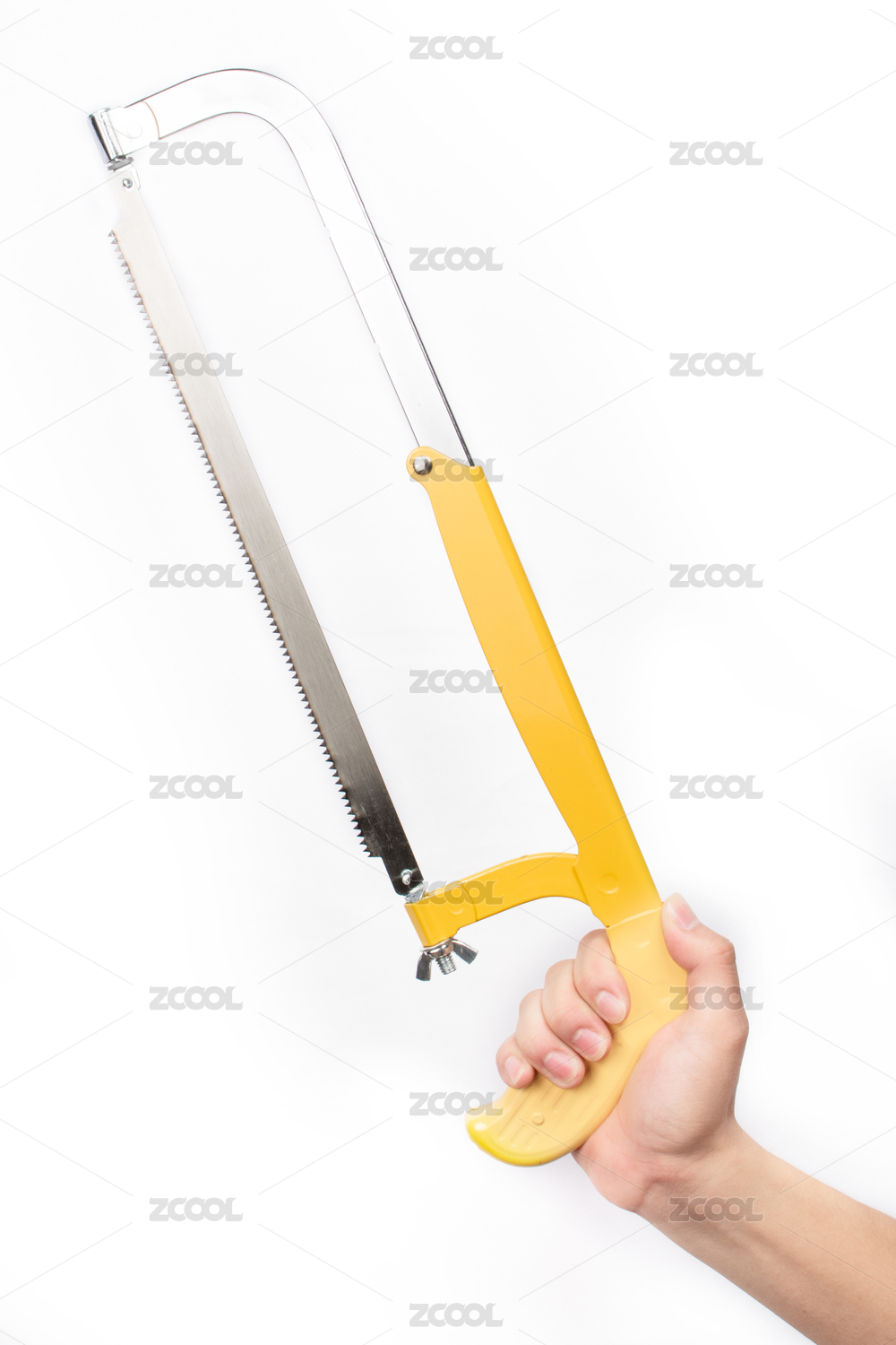 白色背景上一个亚洲人的手握着一把黄色的锯子