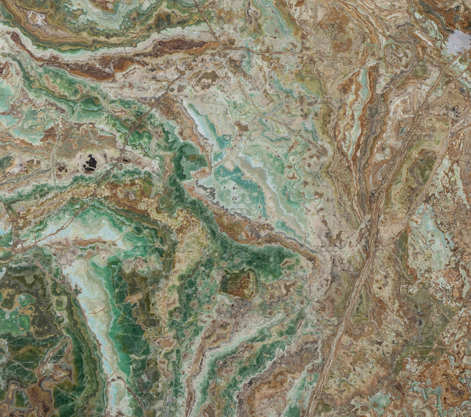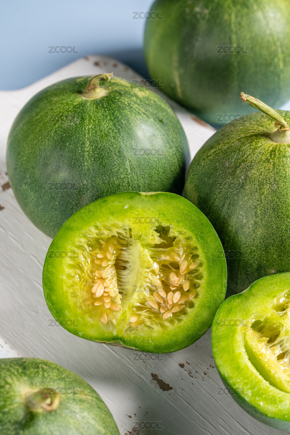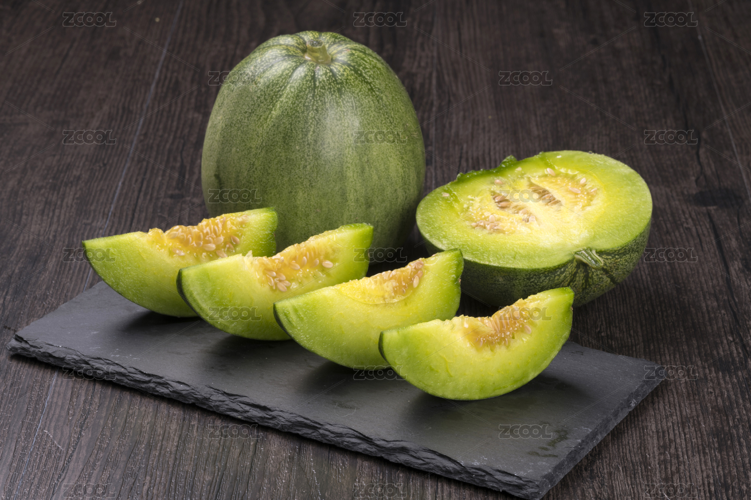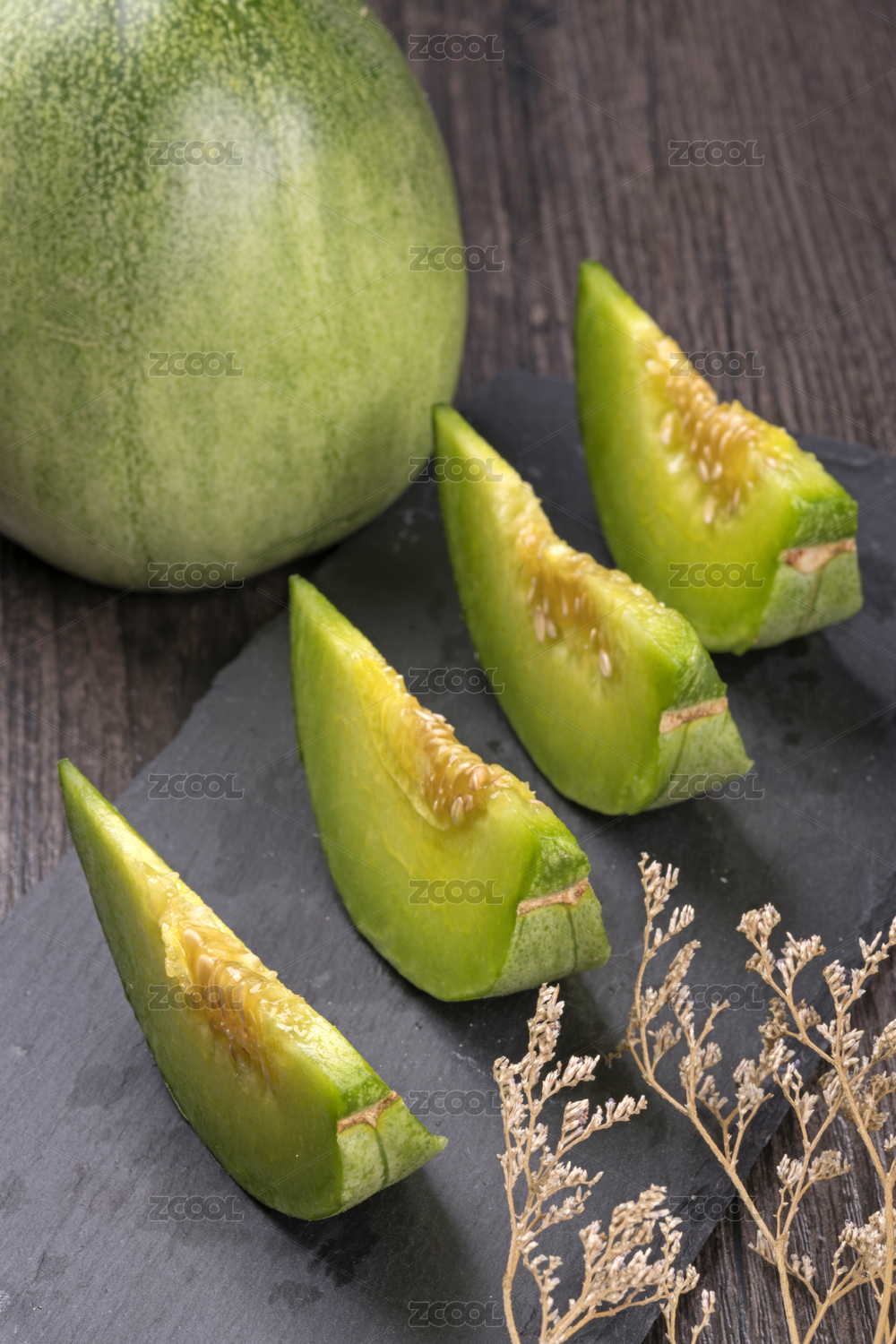 白石底上放着绿皮瓜和切开的薄皮绿宝石甜瓜
