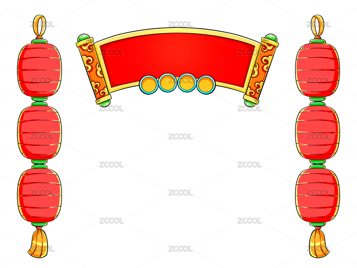 穿红衣服坐在地上双手抱着金元宝的卡通老鼠、灯笼、云纹装饰,新年插画