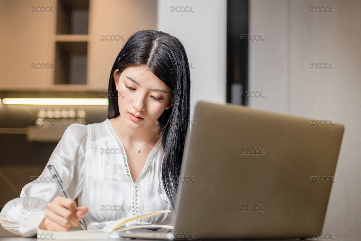 正在边记笔记边看电脑的居家女孩