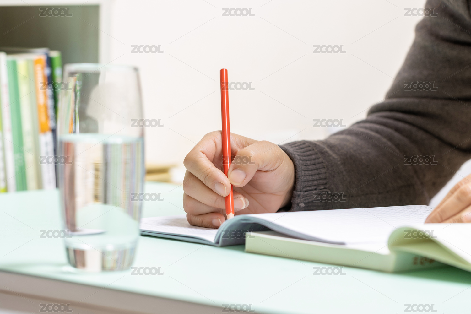 书桌上记笔记写字的手部特写