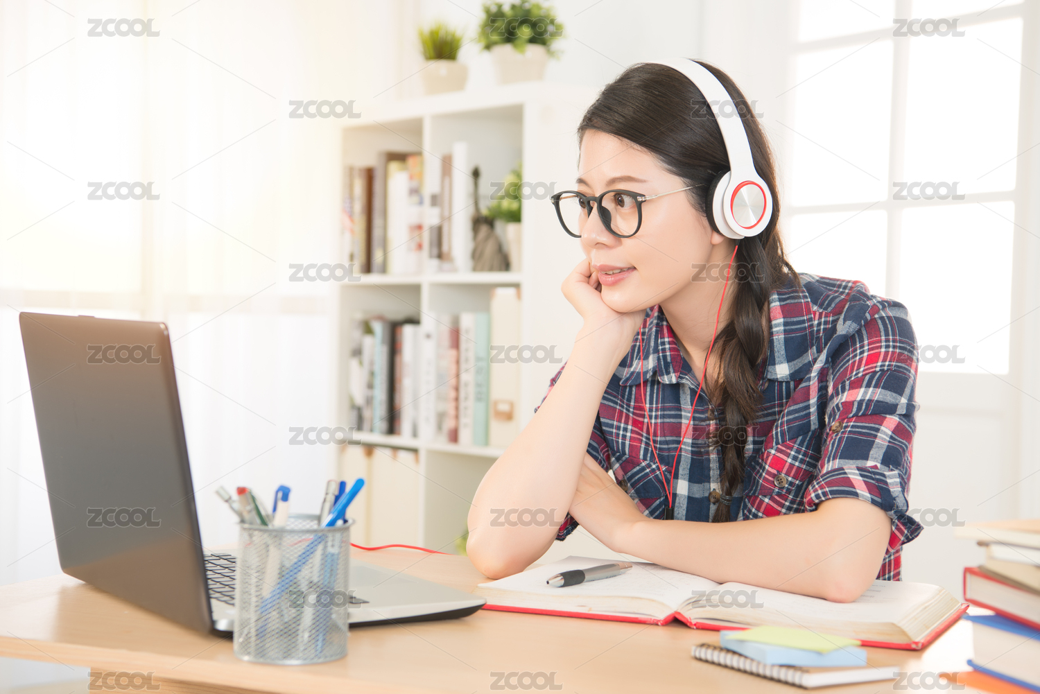 画像的学生学习上的耳机和笔记本电脑记笔记在笔记本坐在她的办公桌在家里线。混血亚洲的中国模式。