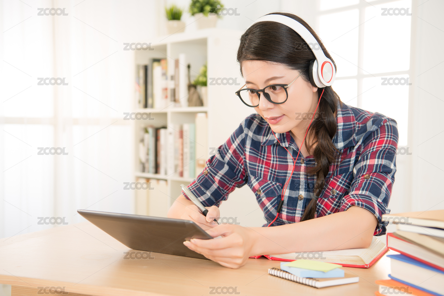 快乐学习的学生在网上观看视频讲座和耳机听和记笔记在家里坐在桌面。混血亚洲的中国模式。