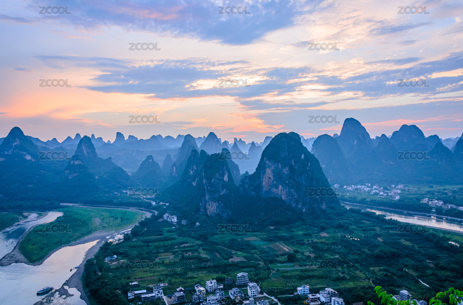桂林兴坪古镇老寨山夕阳落日山水自然风光