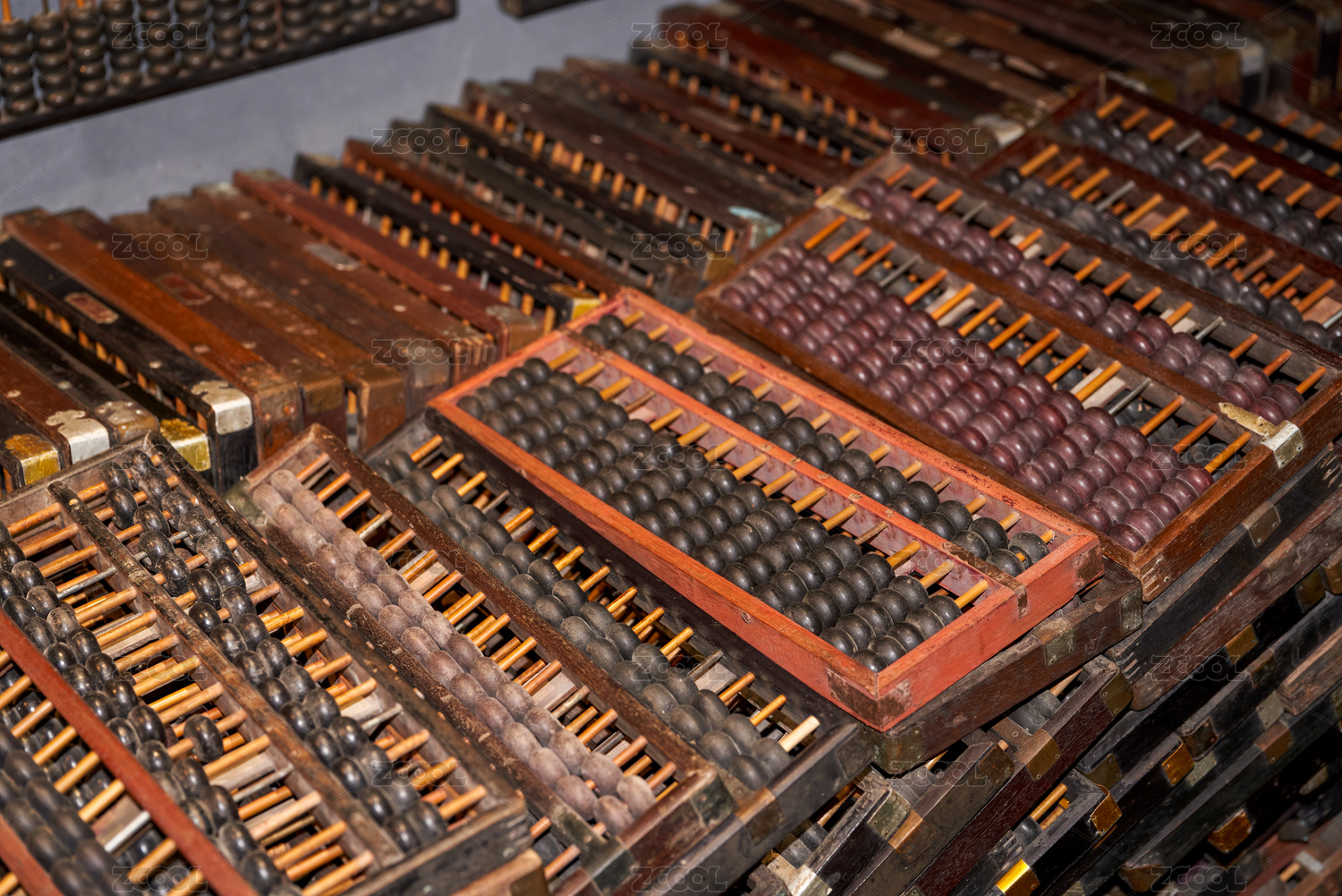 一堆传统复古的中式木质算盘特写