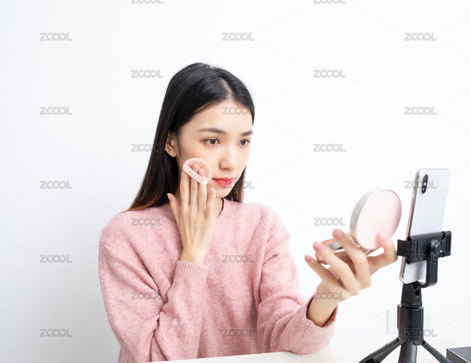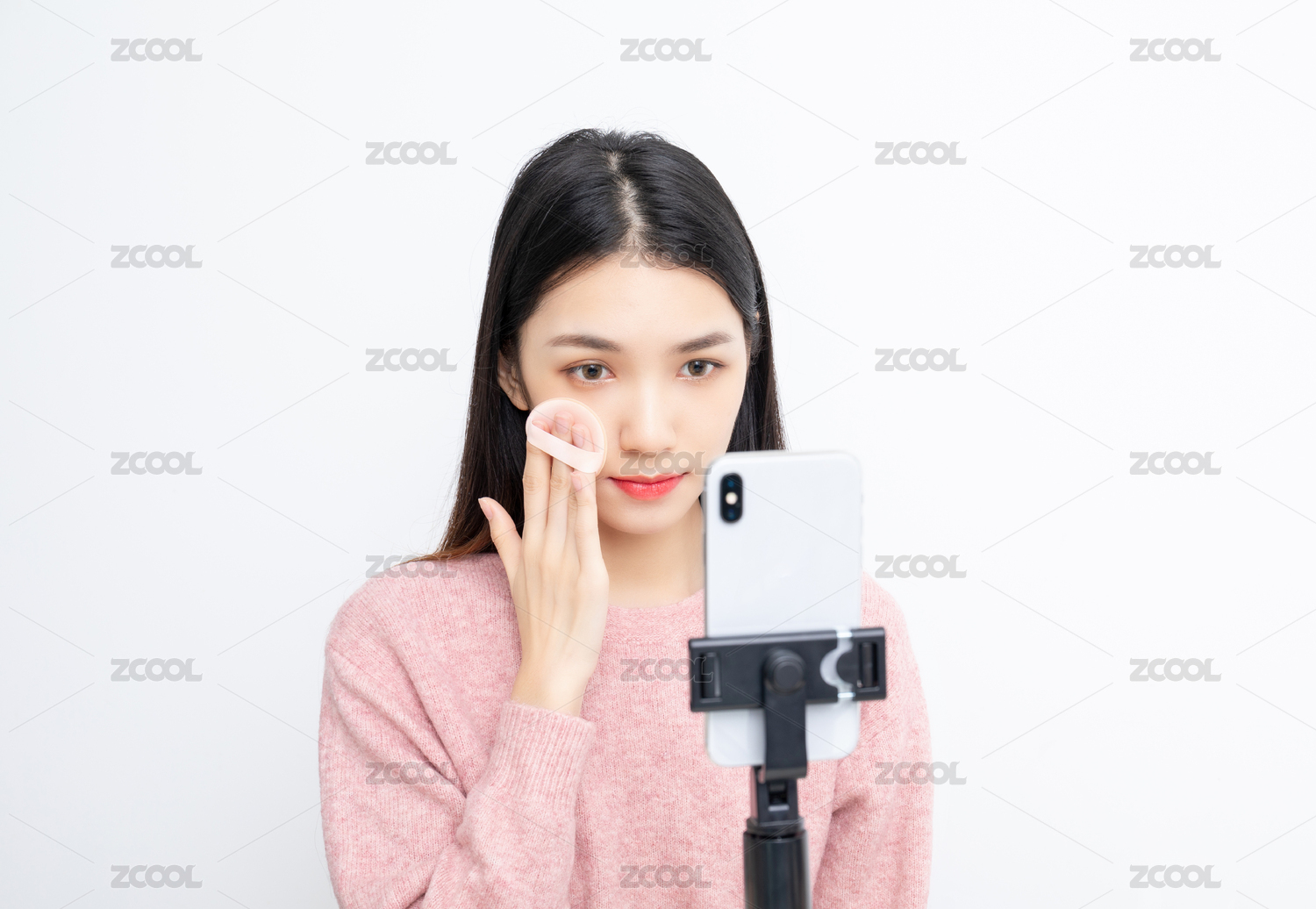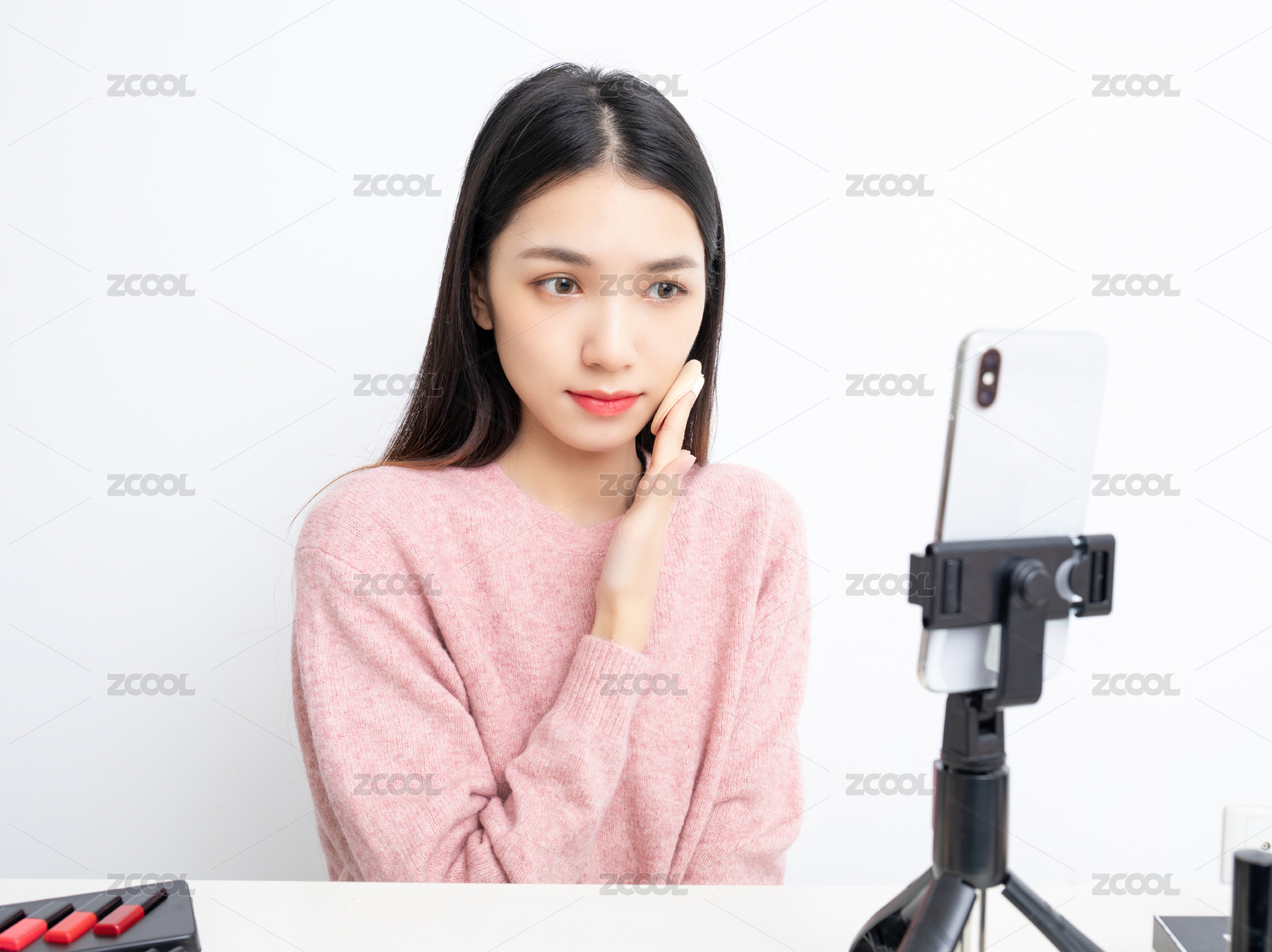 一名在手机镜头前直播化妆的女主播