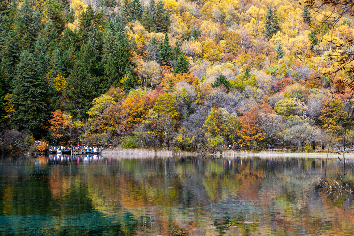 九寨沟秋色,五花海彩林层林尽染湖光山色
