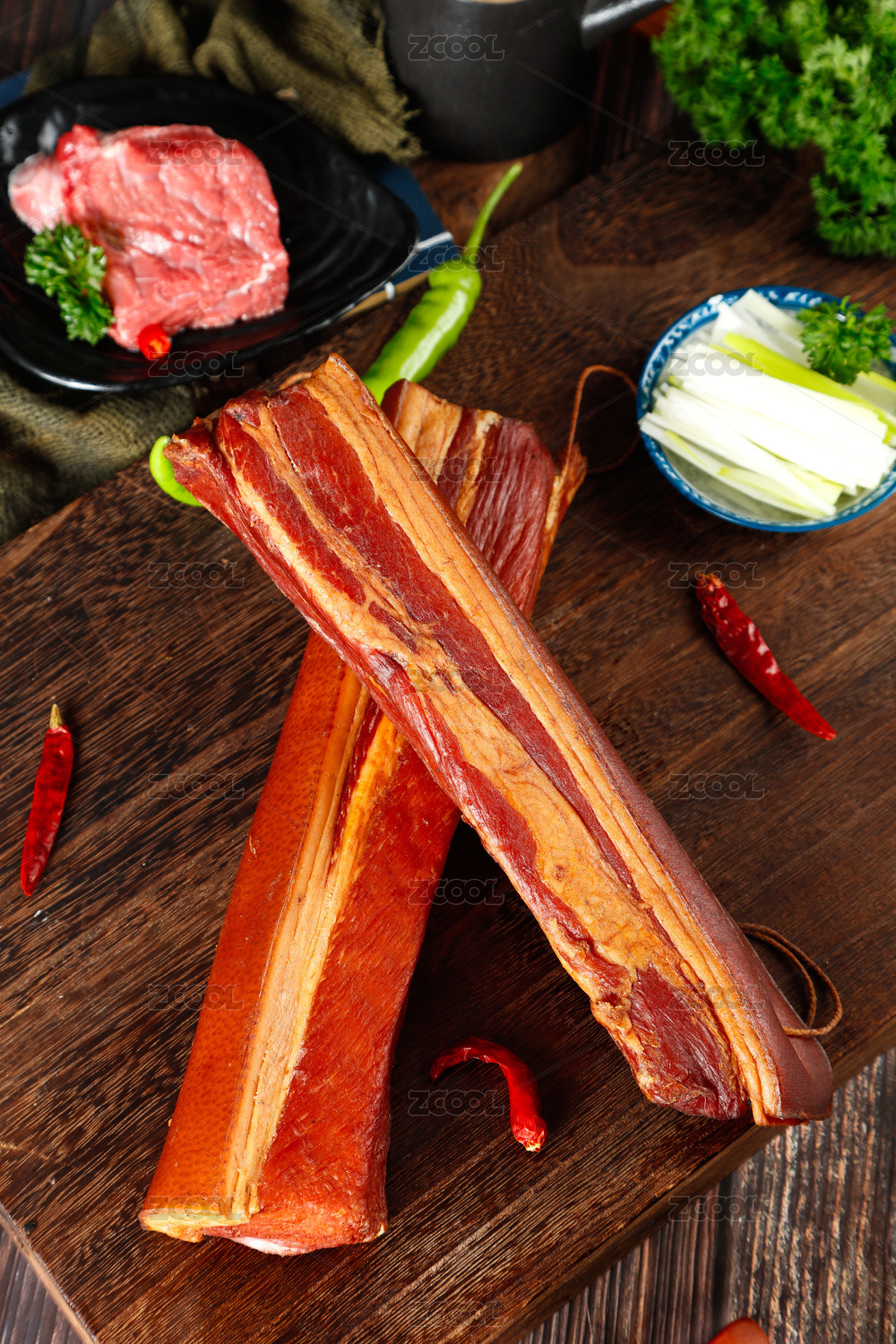 深木底上放着两块五花腊肉