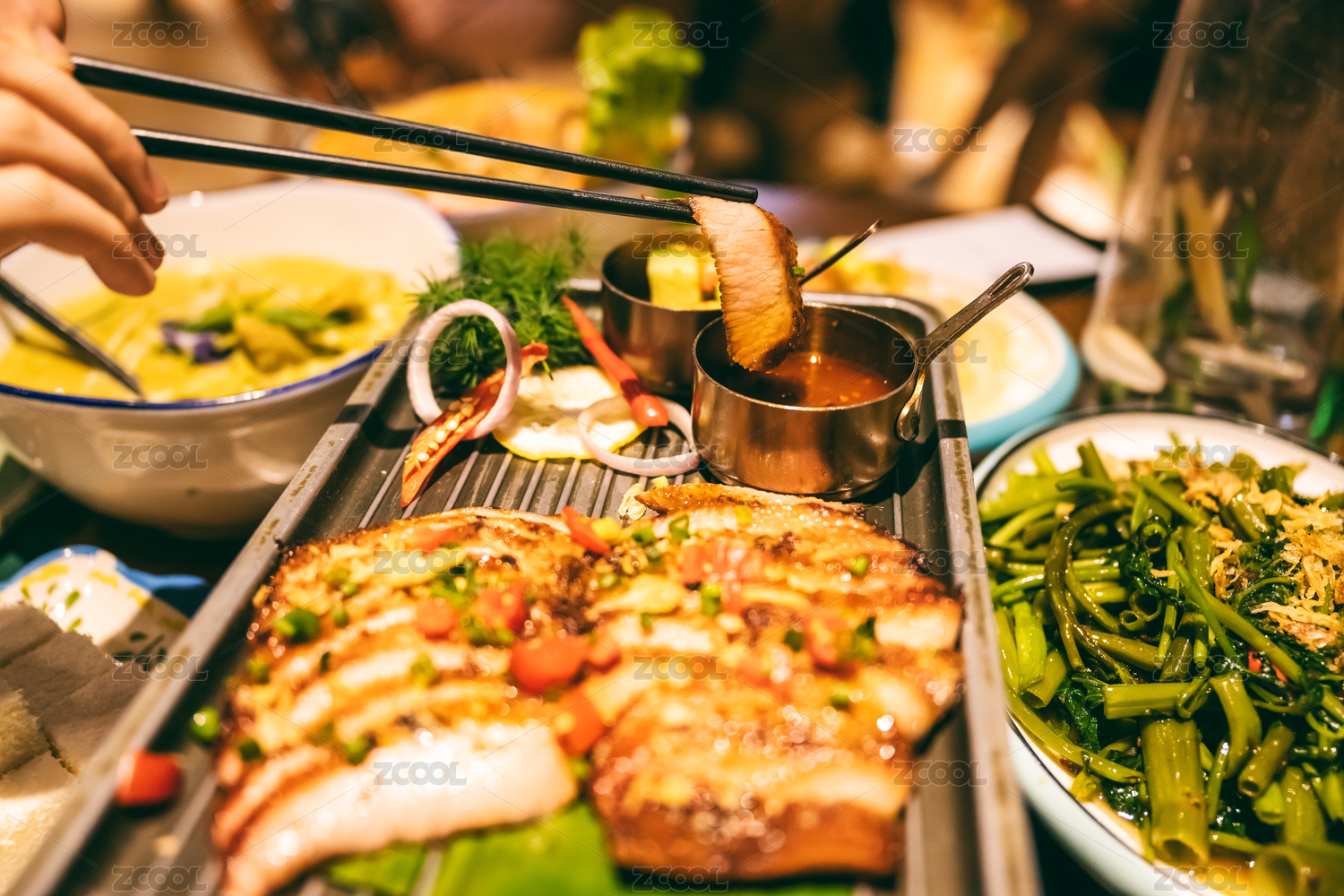 筷子夹起一片五花肉特写